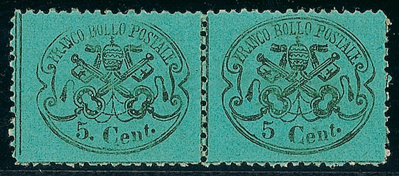 ANTICHI STATI - Pontificio - 1868 - 5 cent - coppia - pezzo di destra senza punto dopo 5 - gomma integra (25/25h - 500+)