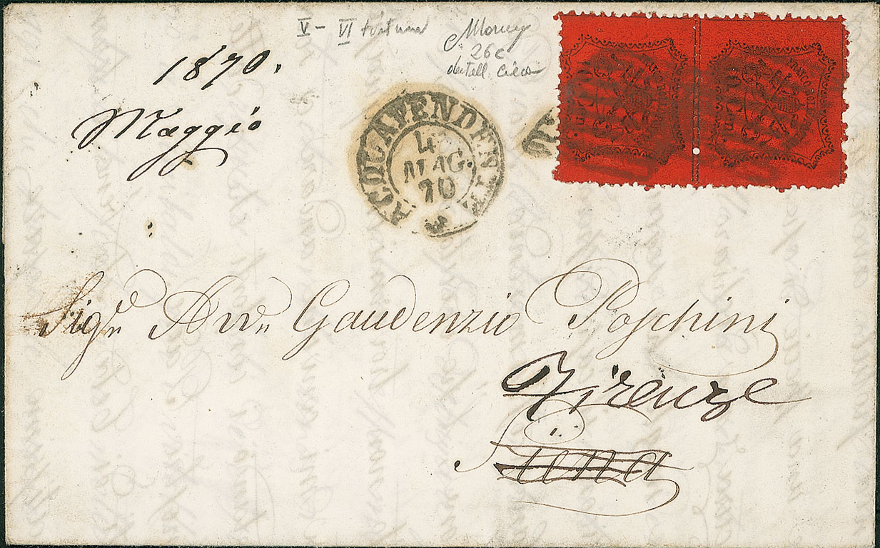 ANTICHI STATI - Pontificio - 10 cent - coppia verticale con dentellatura centrale cieca - lettera da Acquapendente a Siena del 4.5.70 inoltrata a Firenze (26c - punti 4)