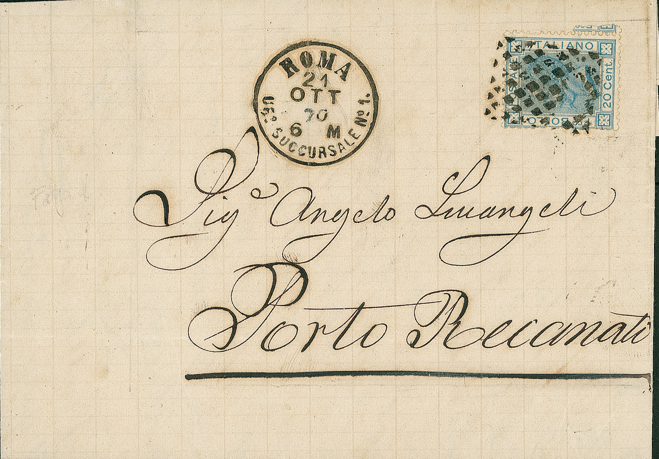 ANTICHI STATI - Pontificio - Rombi di Roma Uff. Succursale N.1 - 20 cent su lettera per Porto Recanati del 21.10.70 (26 Regno - punti 7)