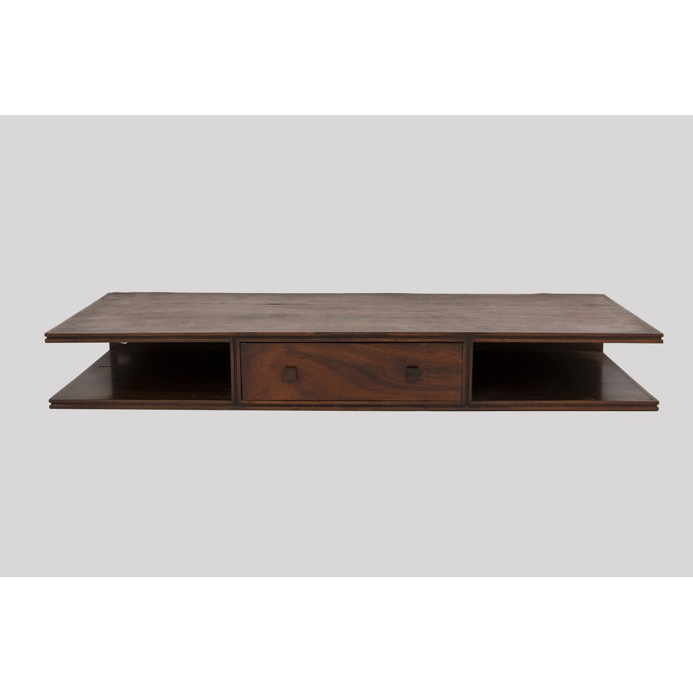 Una mensola consolle in legno di palissandro, due vani a giorno con un cassetto centrale. Usure.