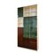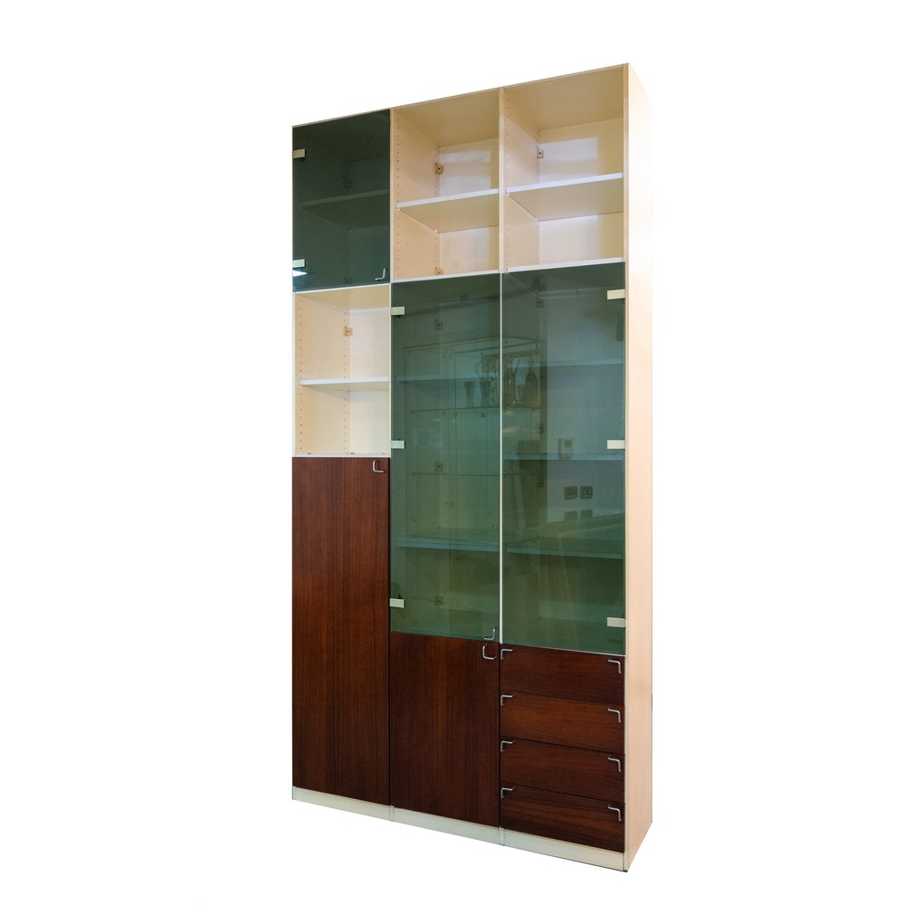 Grande parete attrezzata composta da venticinque vani di tipologia differente e da quattro cassetti; nella composizione sono presenti tre ante vani chiusi con ante in cristallo, un’anta in legno, sei vani con ripiani a giorno.