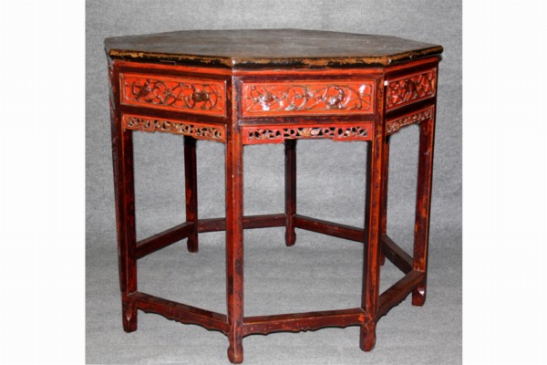 Tavolo esagonale in legno laccato e intagliato a motivi floreali e animali. Cina. XIX secolo. Difetti. Mis. Diam. cm. 105 ca.