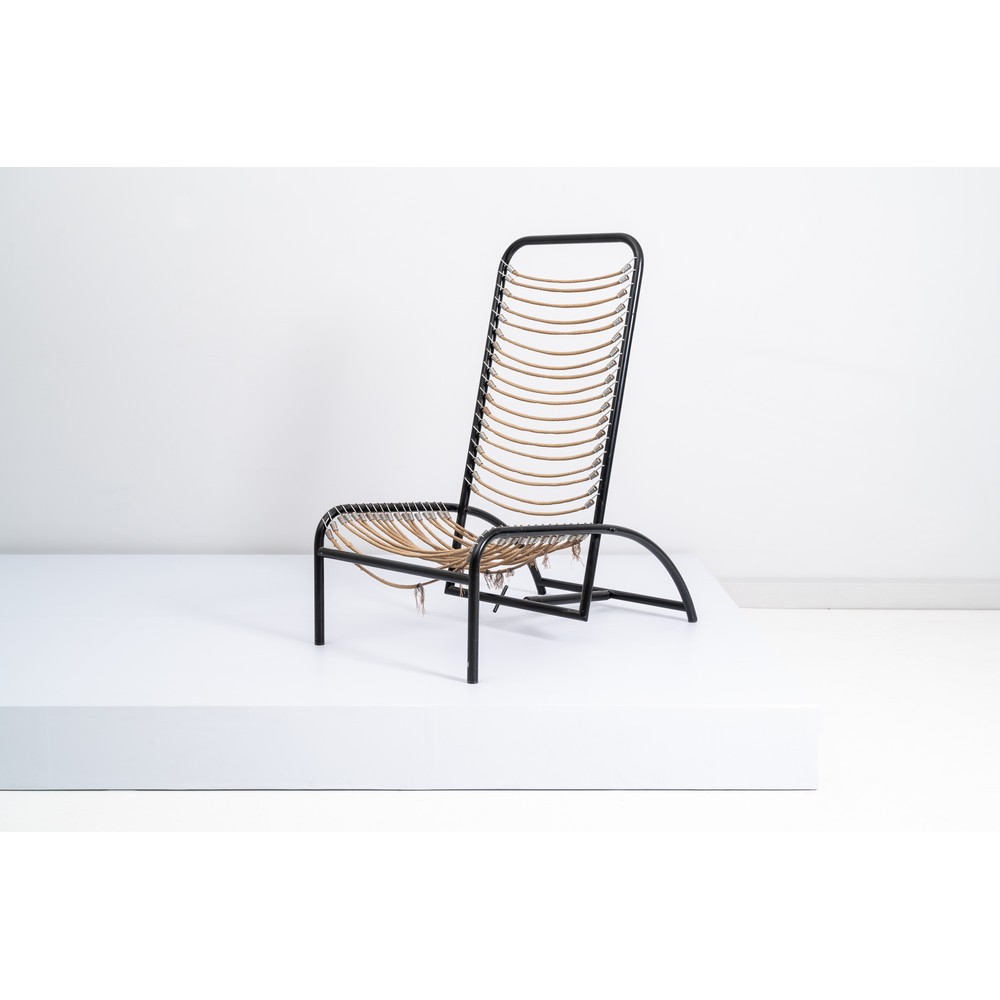 Poltrona bassa con struttura in tondino metallico verniciato nero, spalliera e seduta realizzati con tiranti elastici tubolari e ganci metallici. Cuscini mancanti.