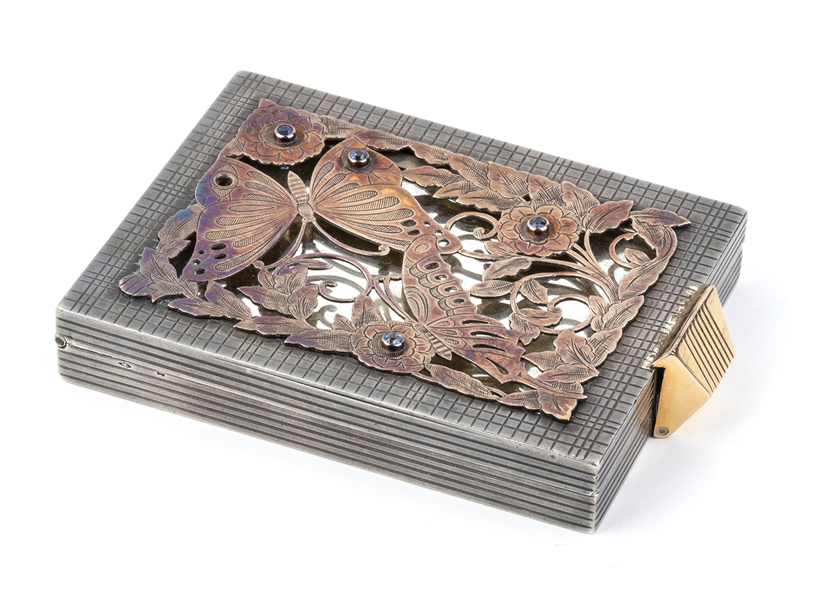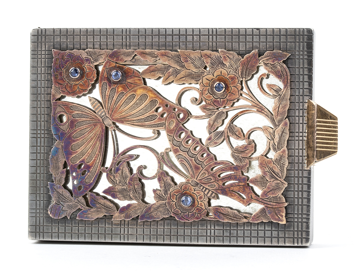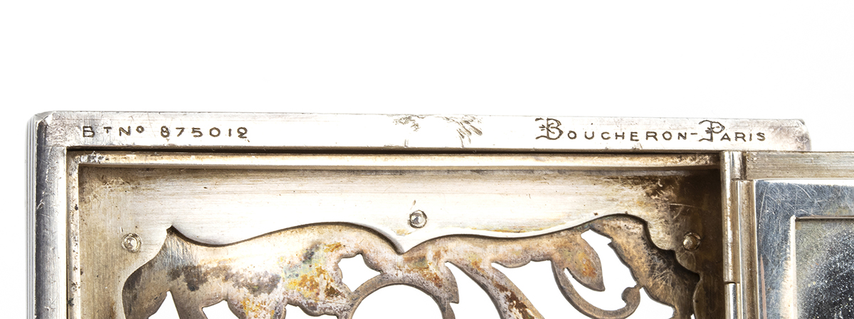 in argento e oro inastonato con zaffiri, firmato "Boucheron Paris", numerato BT n. 875012 e 80440, marchio del fabbricante a forma di losanga, marchio di garanzia a testa di cinghiale francese, marchio per il metallo misto "OR ARGENT". Forma rettangolare con superficie a scacchiera, il pannello traforato con farfalle tra rami frondosi, apertura angolare scanalata per rivelare gli scomparti per specchio e polvere.