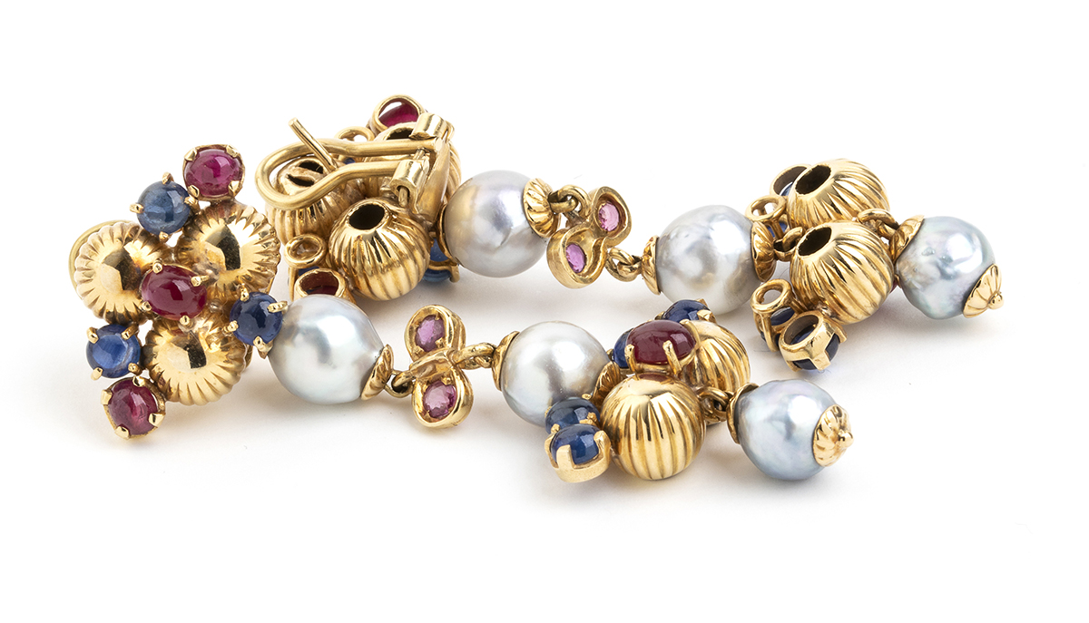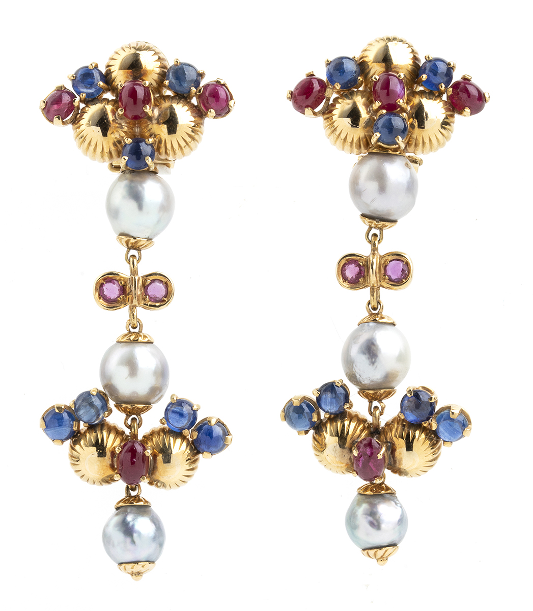Paio di orecchini pendenti con zaffiri, rubini e perle d'acqua dolce - manifattura MORONI Roma