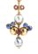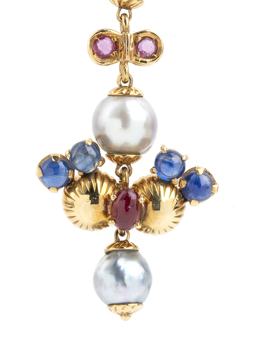 oro giallo 18k, con perle coltivate "d'acqua dolce", incastonati con cabochon di rubini e zaffiri.