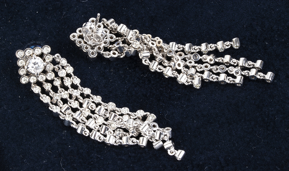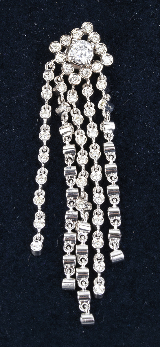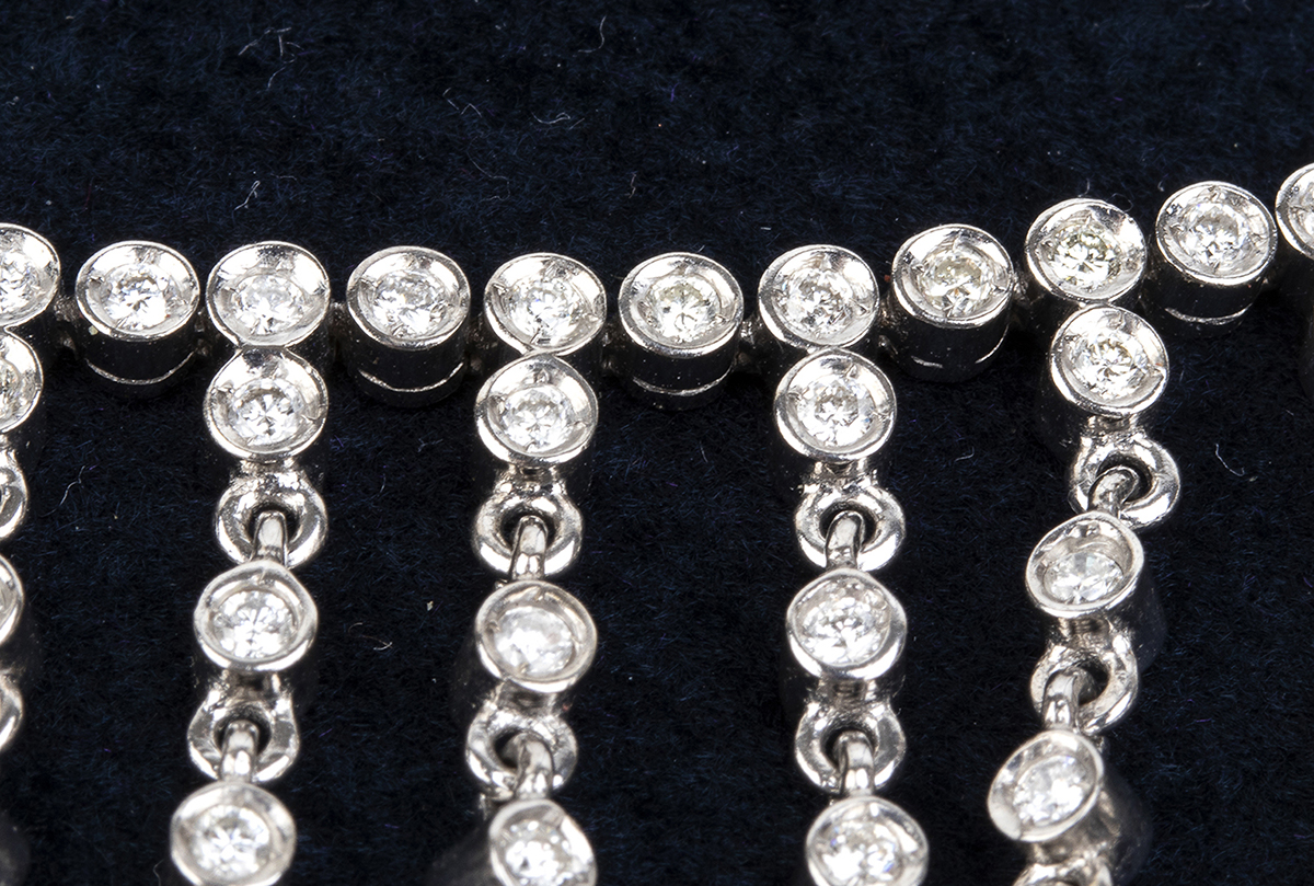 oro bianco 18k, girocollo con frangia ed orecchini pendenti, in diamanti taglio brillante per circa 4,20 ct totali e coppia di damanti centrali degli orecchini per circa 0,60 ct totali, G-H, VS. Firmato PETOCHI e punzonato "750".