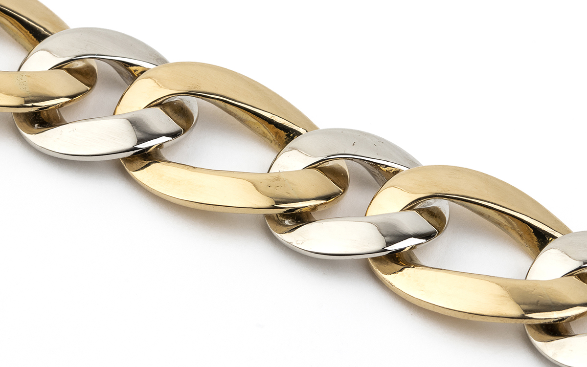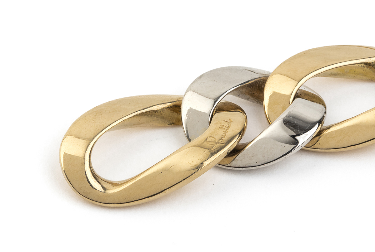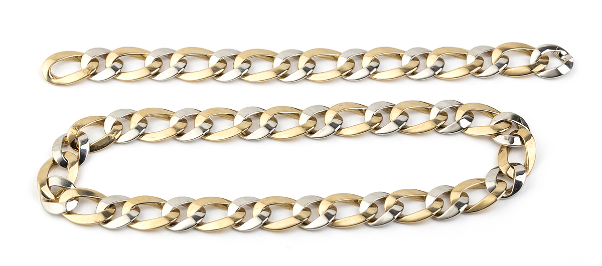 bracciale e girocollo con catena a maglia grumetta in oro giallo ed oro bianco 18k. Lunghezza bracciale 18 cm circa. Lunghezza girocollo 38 cm circa. Firmati POMELLATO. e punzonati "750".