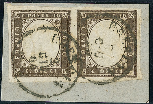 ANTICHI STATI - Sardegna - 1859 - coppia del 10 cent bruno cioccolato scuro - Brescia 2.6.60 (14Af)