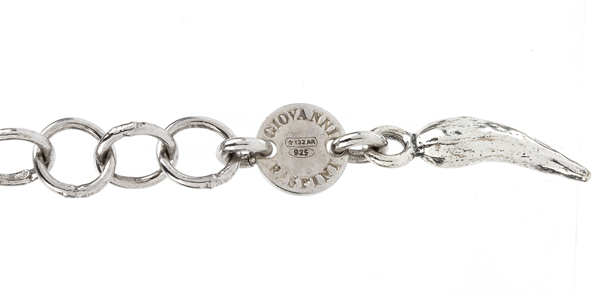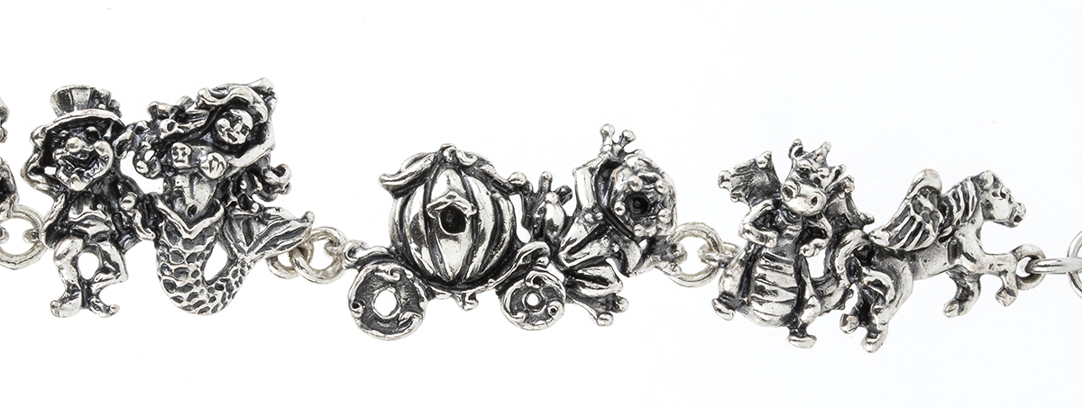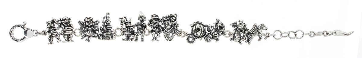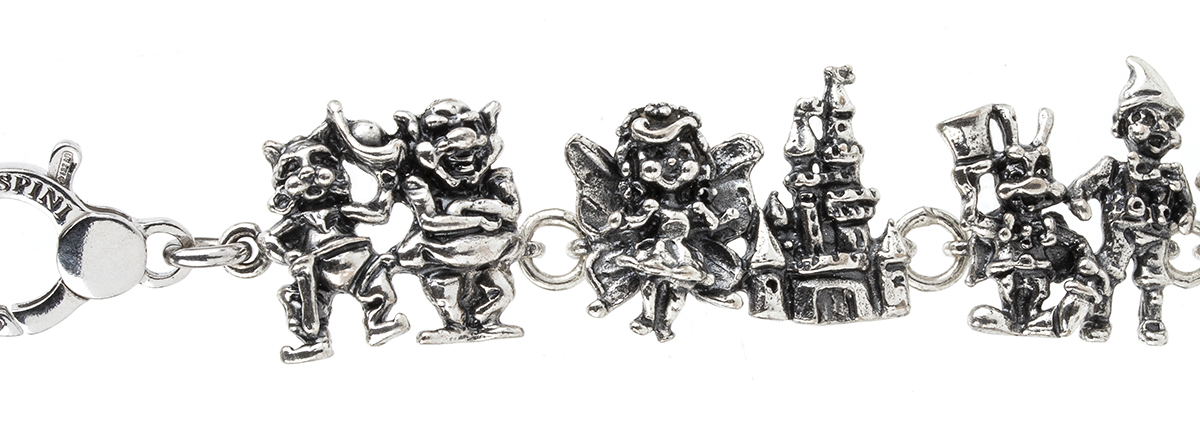 Giovanni Raspini dedica un bracciale al mondo delle favole rappresentandone alcuni personaggi o motivi iconici. Argento 925/1000, punzonato "GIOVANNI RASPINI - 132 AR - 925".