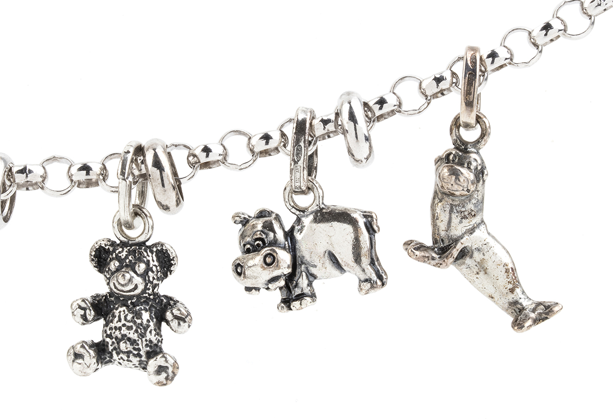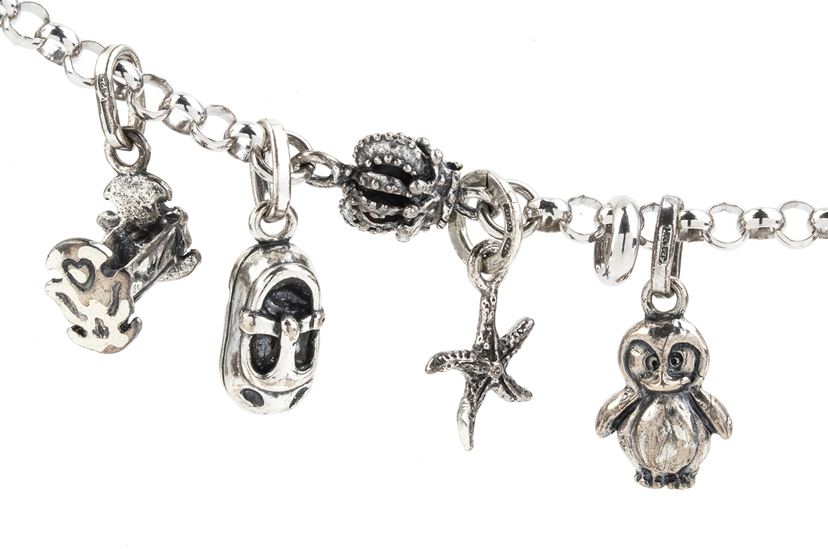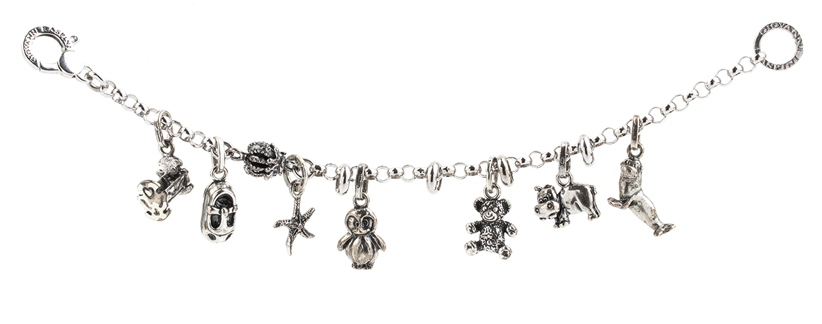 con pendenti a soggetti vari. Argento 925/1000, punzonato "GIOVANNI RASPINI - 132 AR - 925".