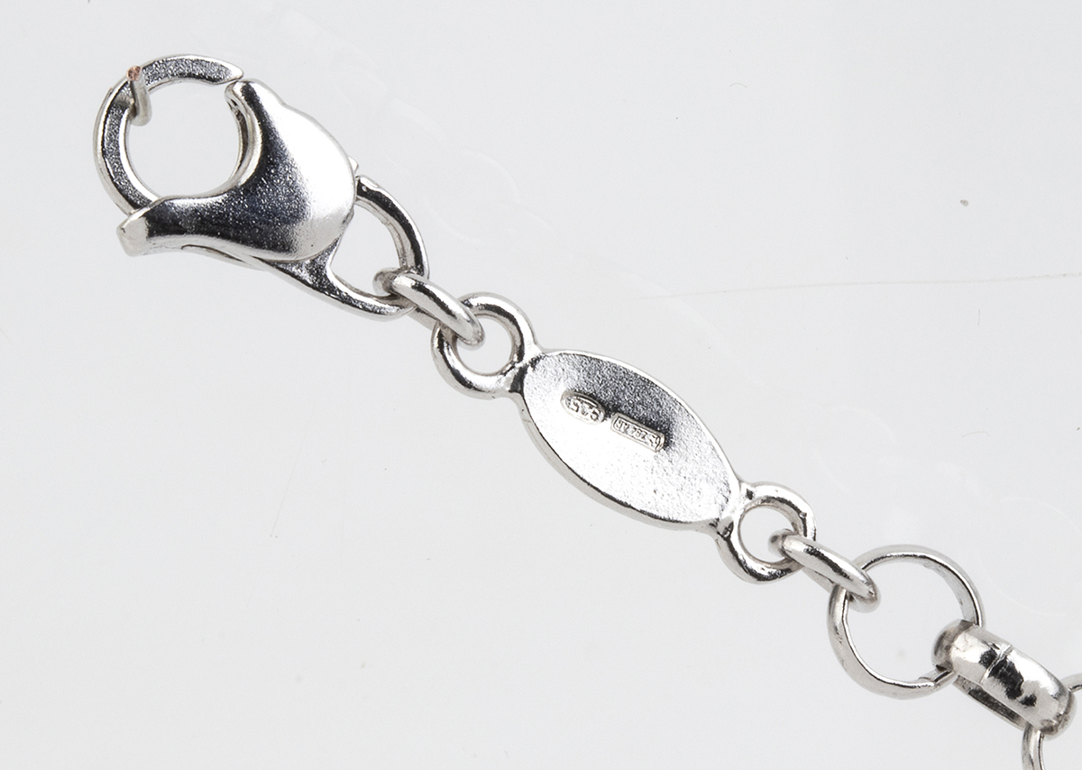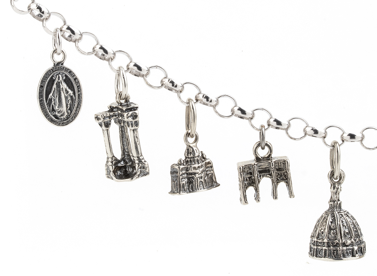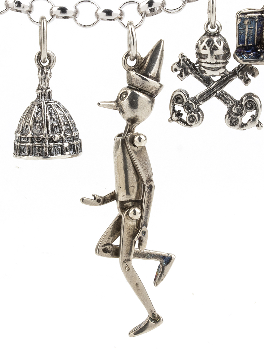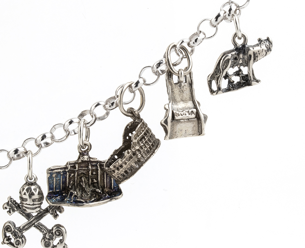 Tedora dedica un bracciale alla splendida città di Roma rappresentandone i tipici monumenti, luoghi e simboli, aggiunta di un Pinocchio articolato. Argento 925/1000, punzonato "TEDORA - 294 AR - 925".