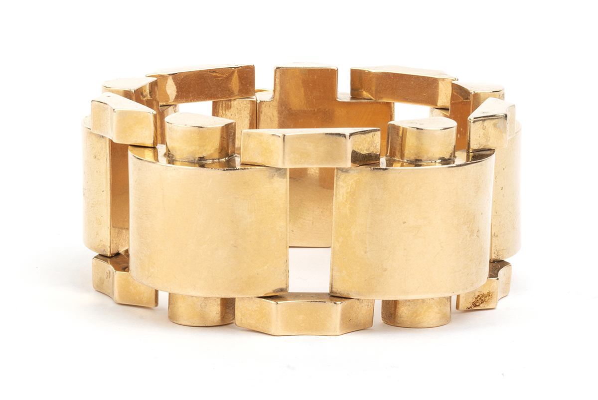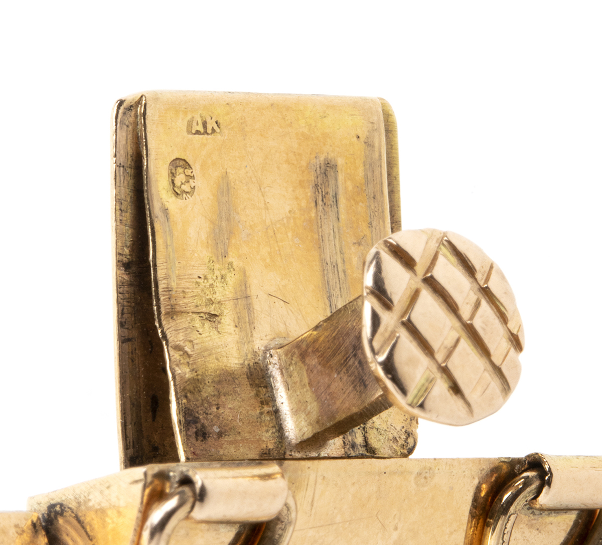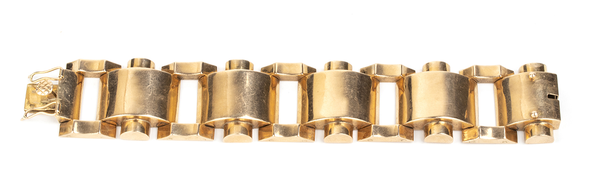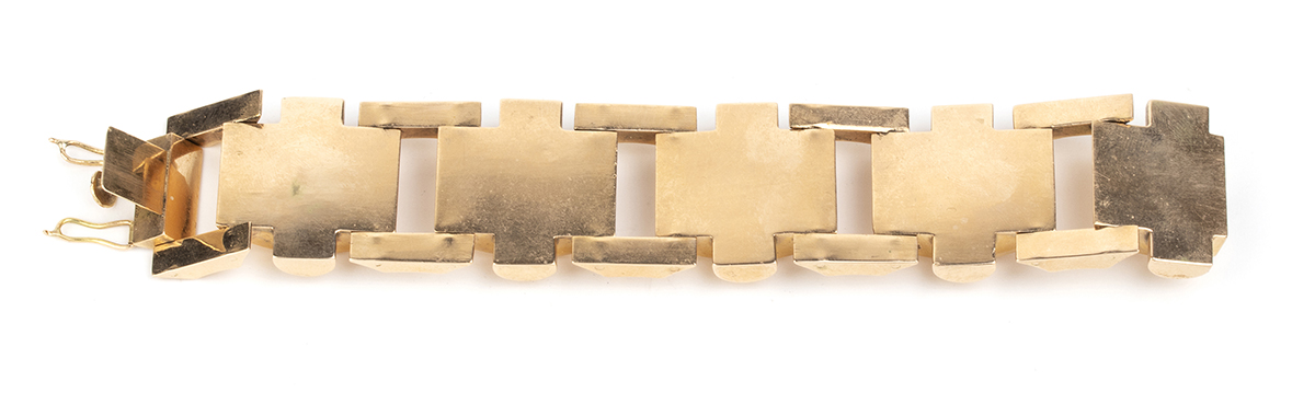 in oro giallo 18k con un distinto design "Machine Age". Gli elementi esterni delle maglie flessibili di questo braccialetto sono finemente lavorati a mano come semidischi con gli elementi centrali che ricordano dei gradini rettangolari inclinati. Il design ricorda una scala mobile, un design popolare dell'epoca. L'alta lucentezza dell'oro crea un meraviglioso gioco di luci ed ombre dando a questo gioiello un vero look tridimensionale. Punzonato "AK".