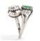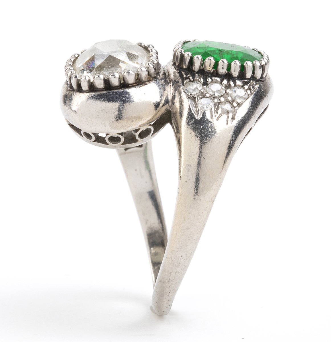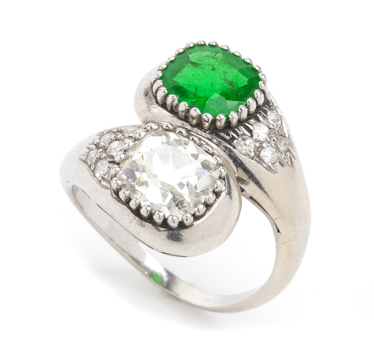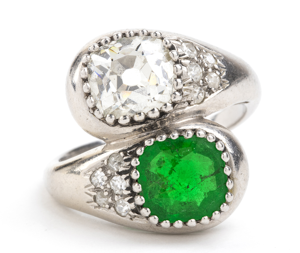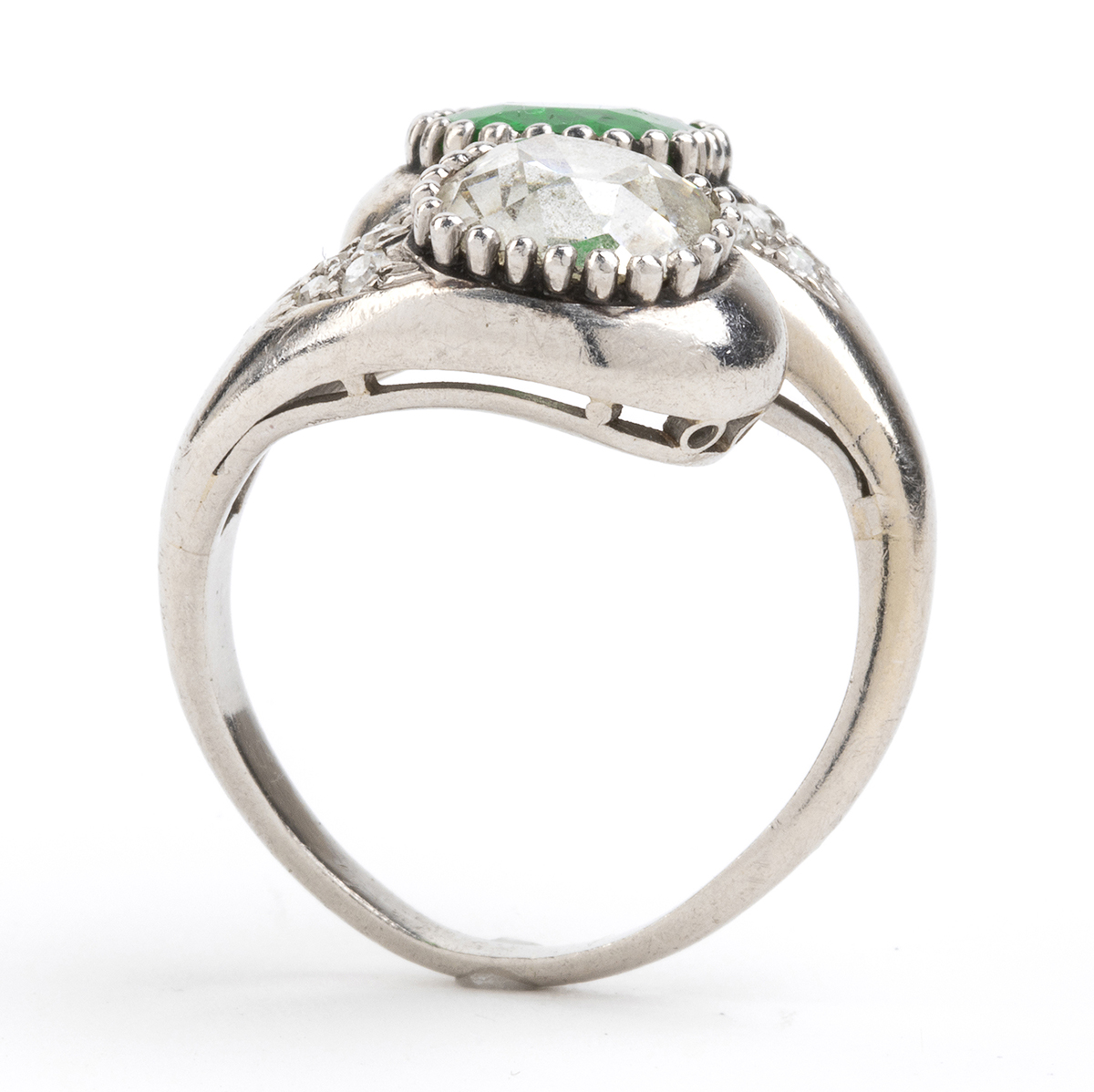 platino. Motivo contrarié, incastonato con smeraldo e diamante taglio vecchio europeo, dettagli in diamanti taglio huit-huit. Smeraldo di forma ovale, taglio composito 1,60 ct circa. Diamante taglio vecchio europeo 2,00 ct circa.