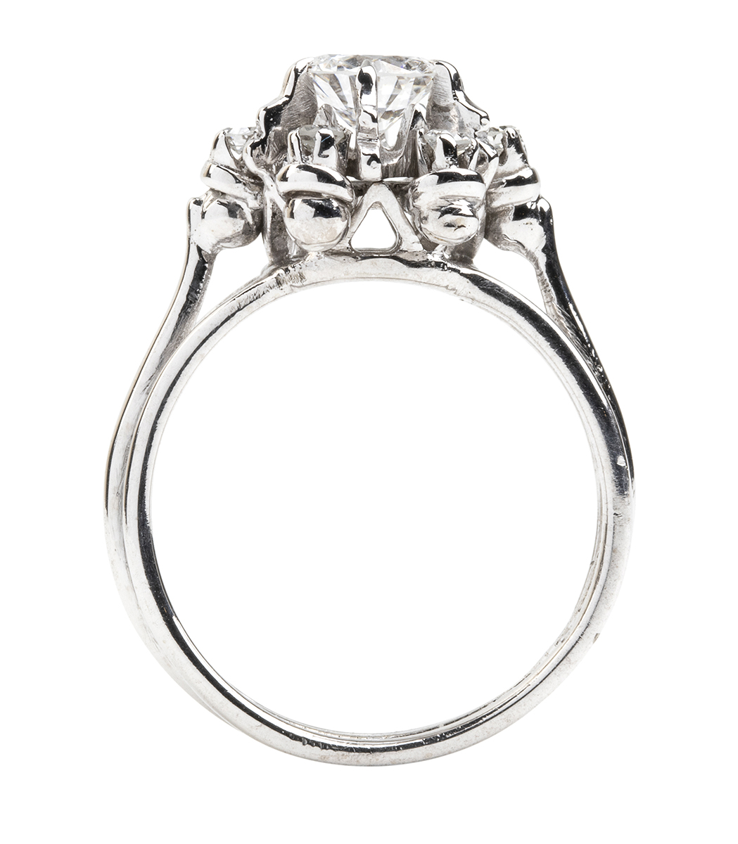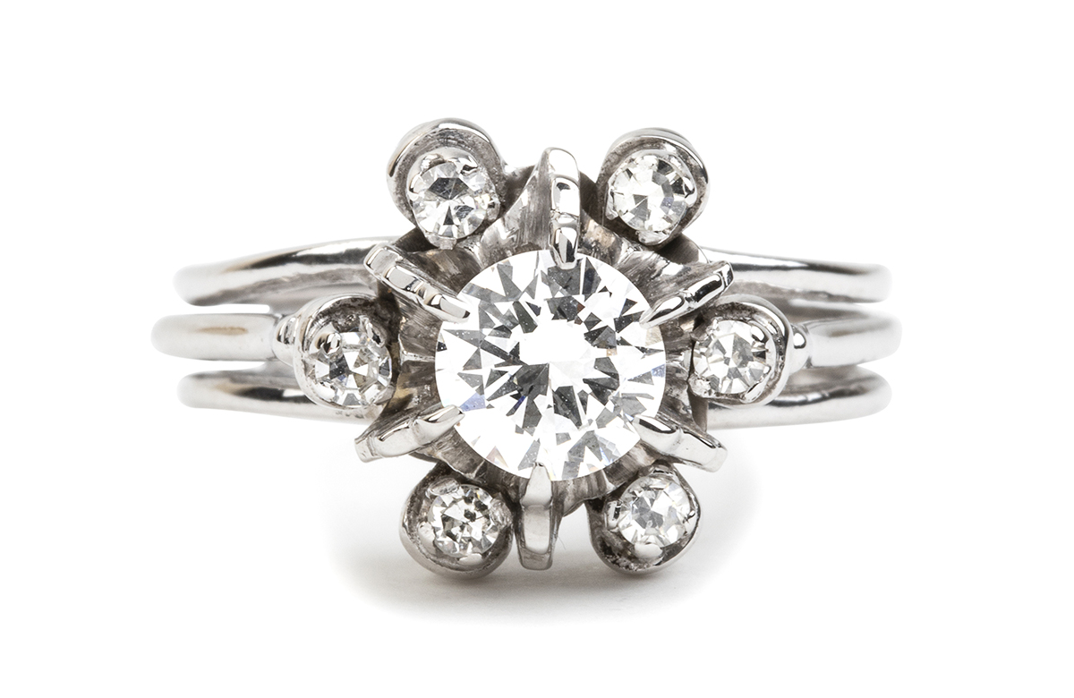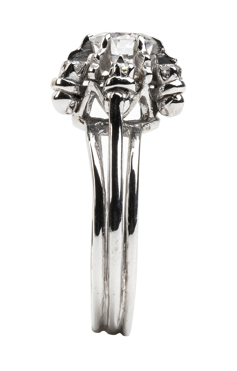 oro bianco, 18k, motivo a fiore con diamante taglio brillante centrale 0,65 ct circa, F-G, VVS, contornato da diamanti taglio huit-huit 0,30 ct circa, G, VVS-VS. Punzonato "750".