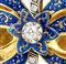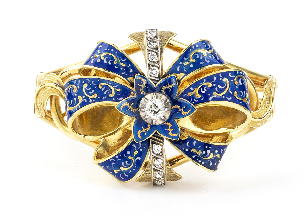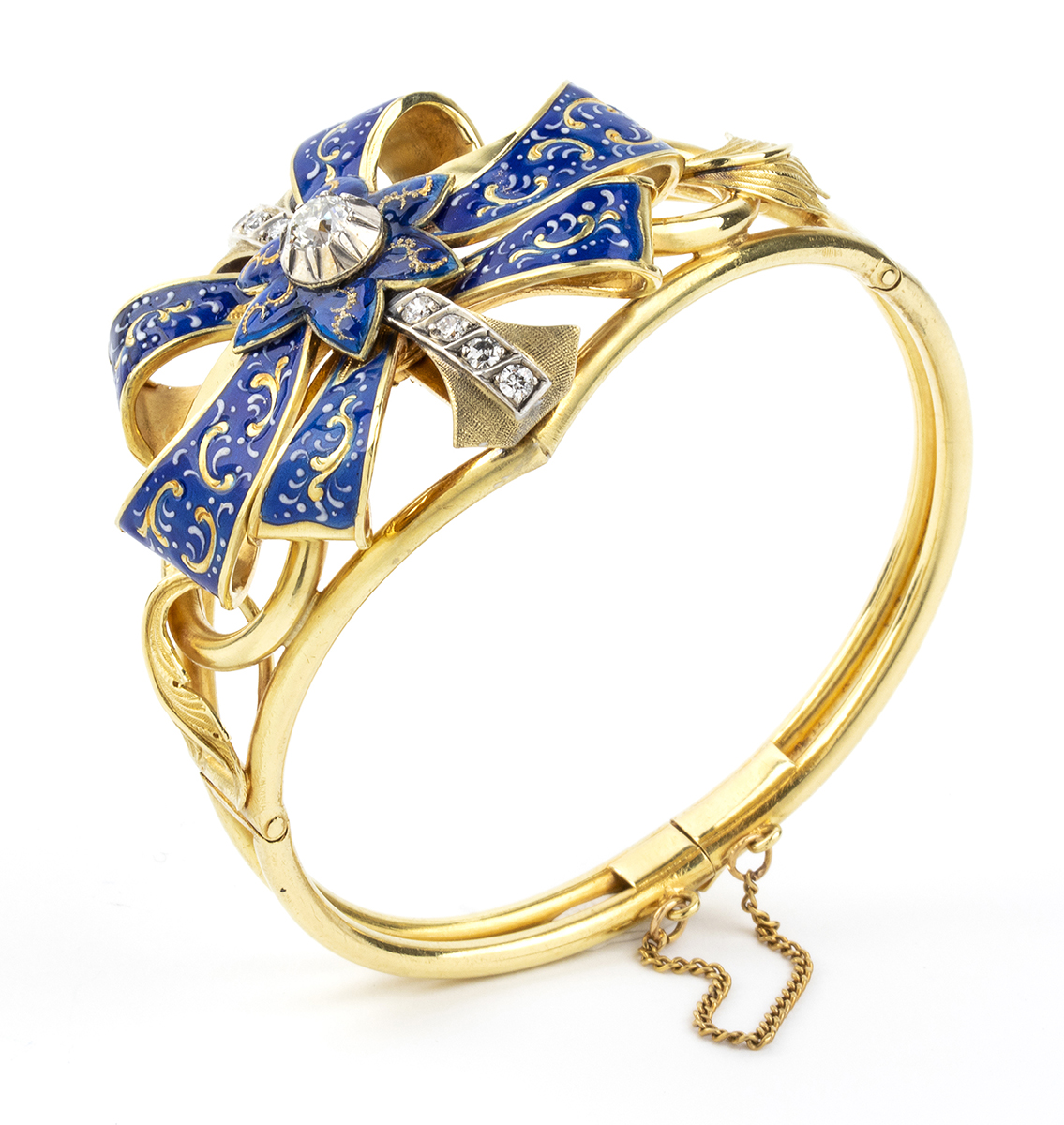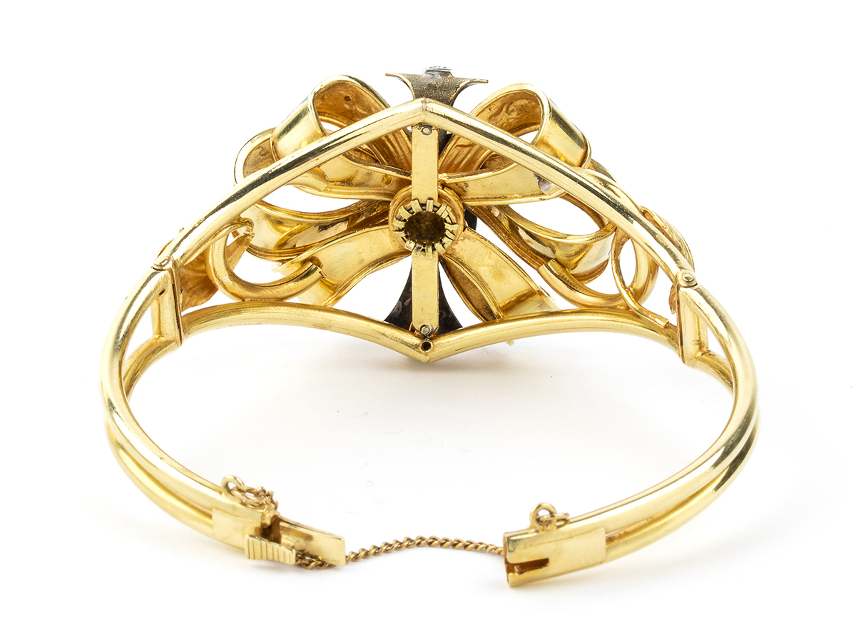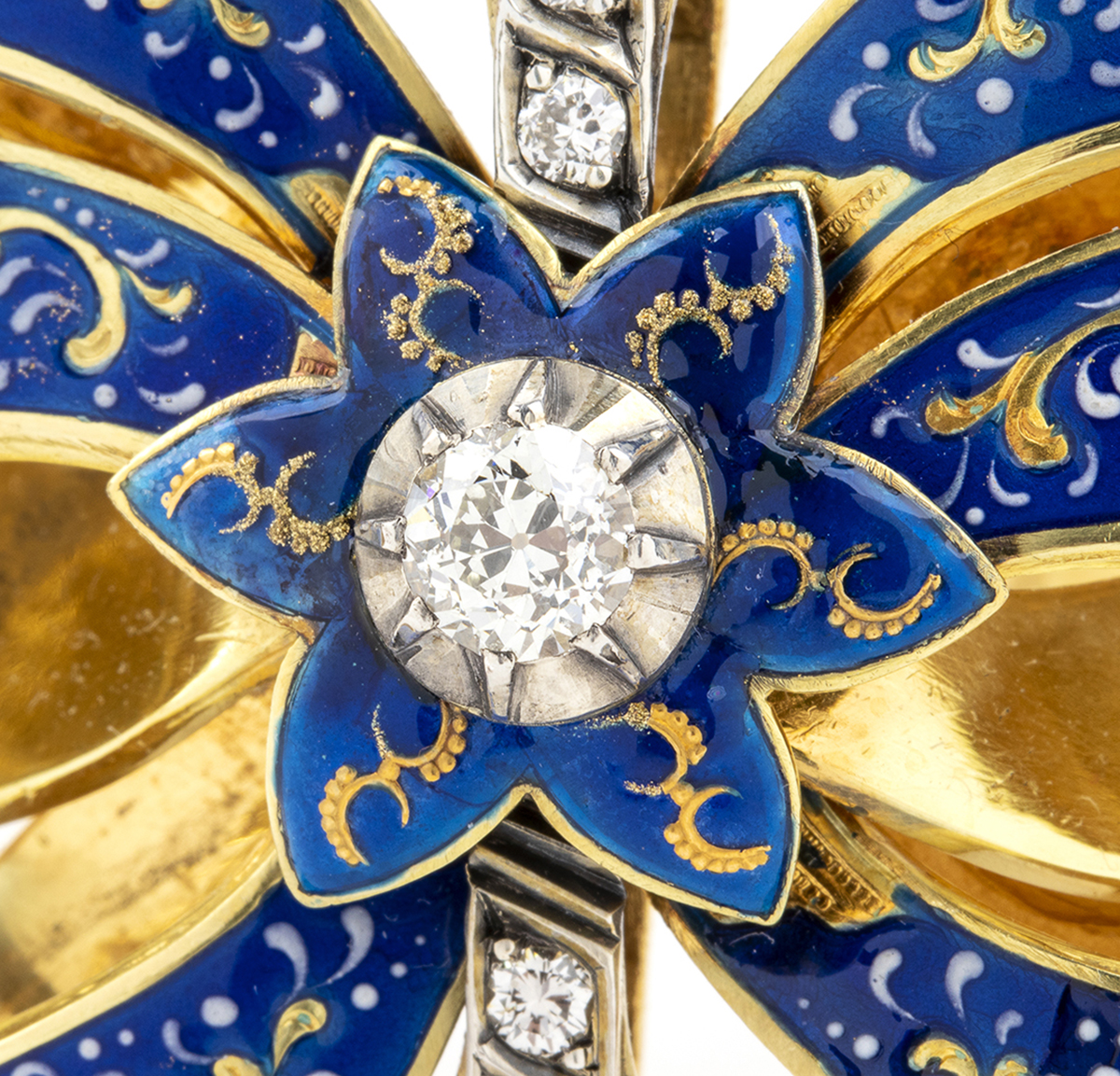 oro giallo ed oro bianco 18k, motivi vegetali e nastro centrale in smalti e diamanti. Diamante centrale taglio vecchio europeo 0,60 ct circa, nastri in diamanti taglio huit-huit e taglio brilante 0,30 ct circa. Peso 45,70 gr.
