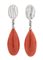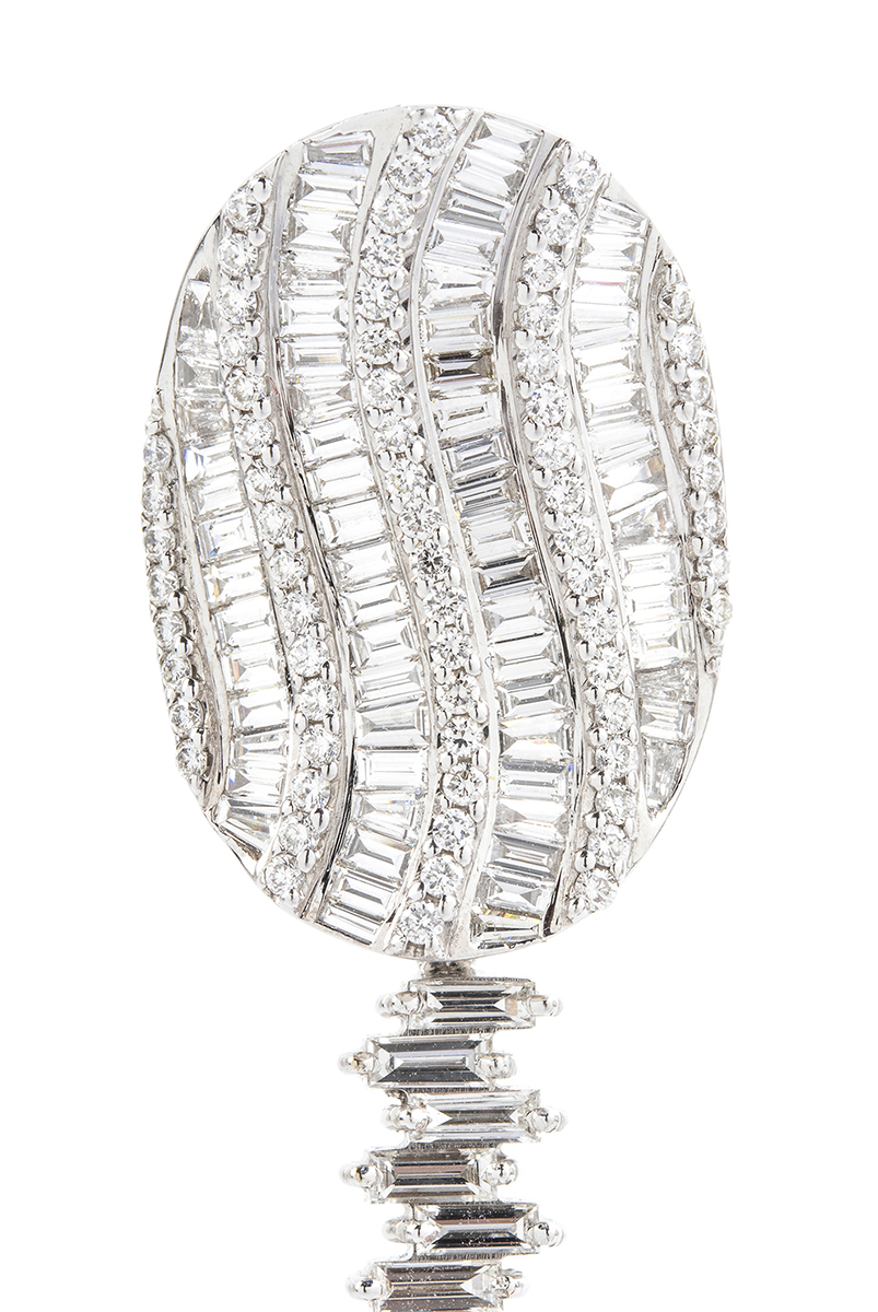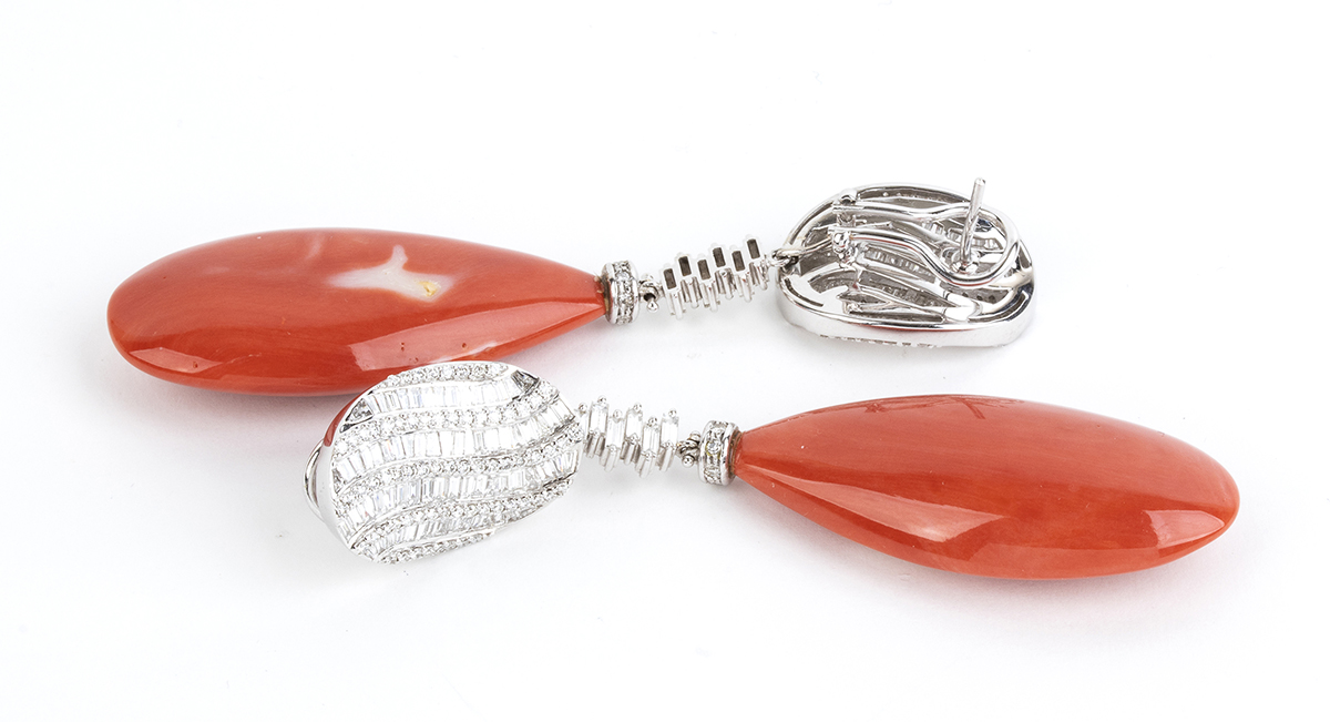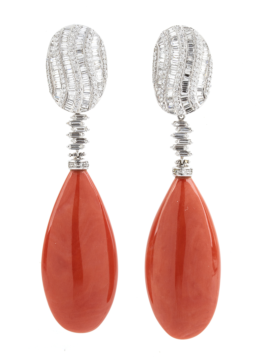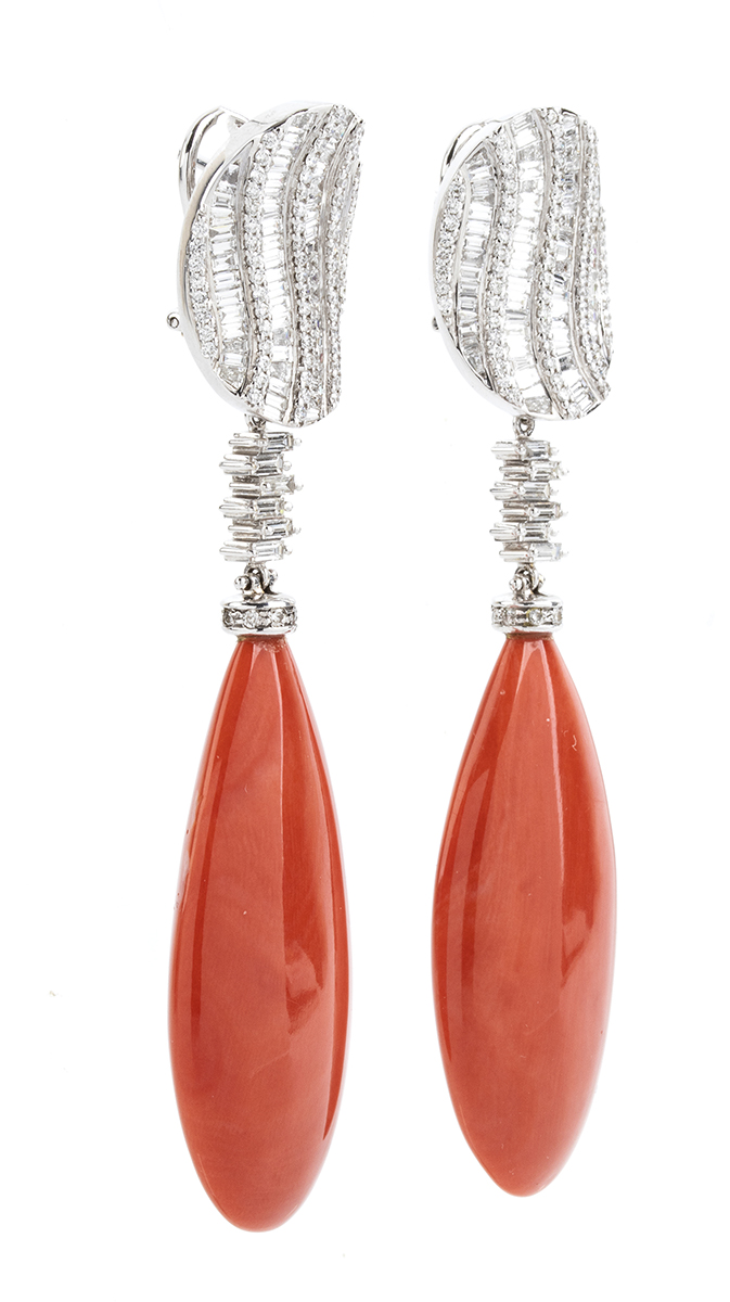 oro bianco 18k, ciascuno con clip in pavé di diamanti che sospende una linea di diamanti taglio baguette ed una goccia di corallo cerasuolo (corallium elatius). La goccia di corallo è amovibile. Diamanti rettangolari e tapered 7,50 ct circa, F-G, IF-VVS, diamanti taglio brillante 1,00 ct circa F-G, IF-VVS. Punzonato "750".