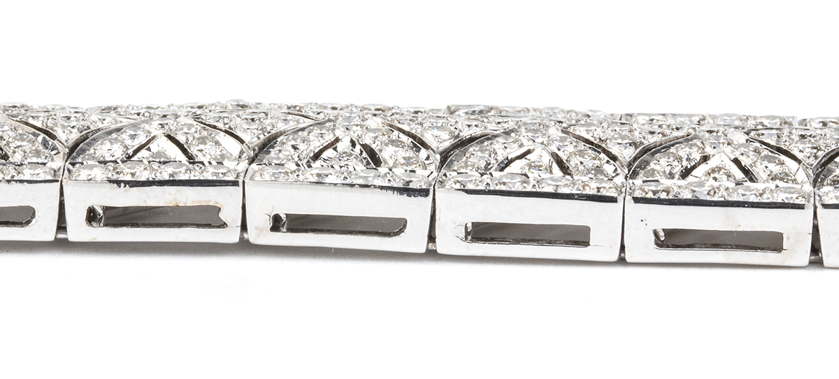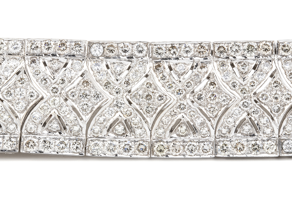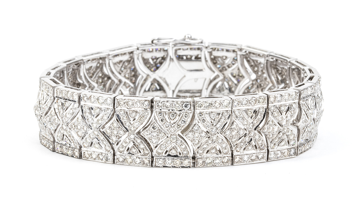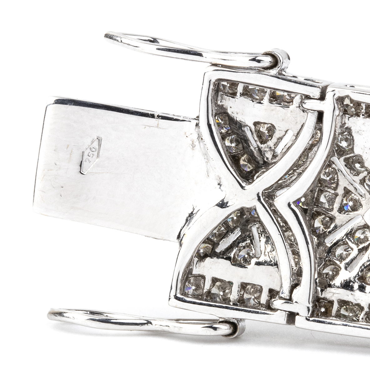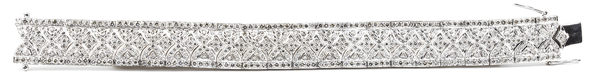 oro bianco 18k, modellato come un sosttile nastro a maglie snodate, traforate ed incastonate con pavé di diamanti taglio brillante 9,00 ct circa, G-I, VVS -VS. Punzonato "750".