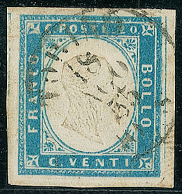 ANTICHI STATI - Sardegna - 1855 - 20 cent - Torino 18.8.55 - G.Bolaffi (15 - 1.400)