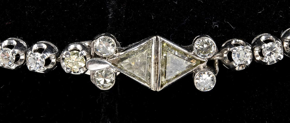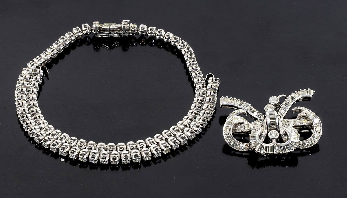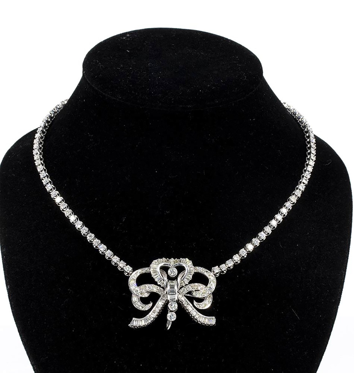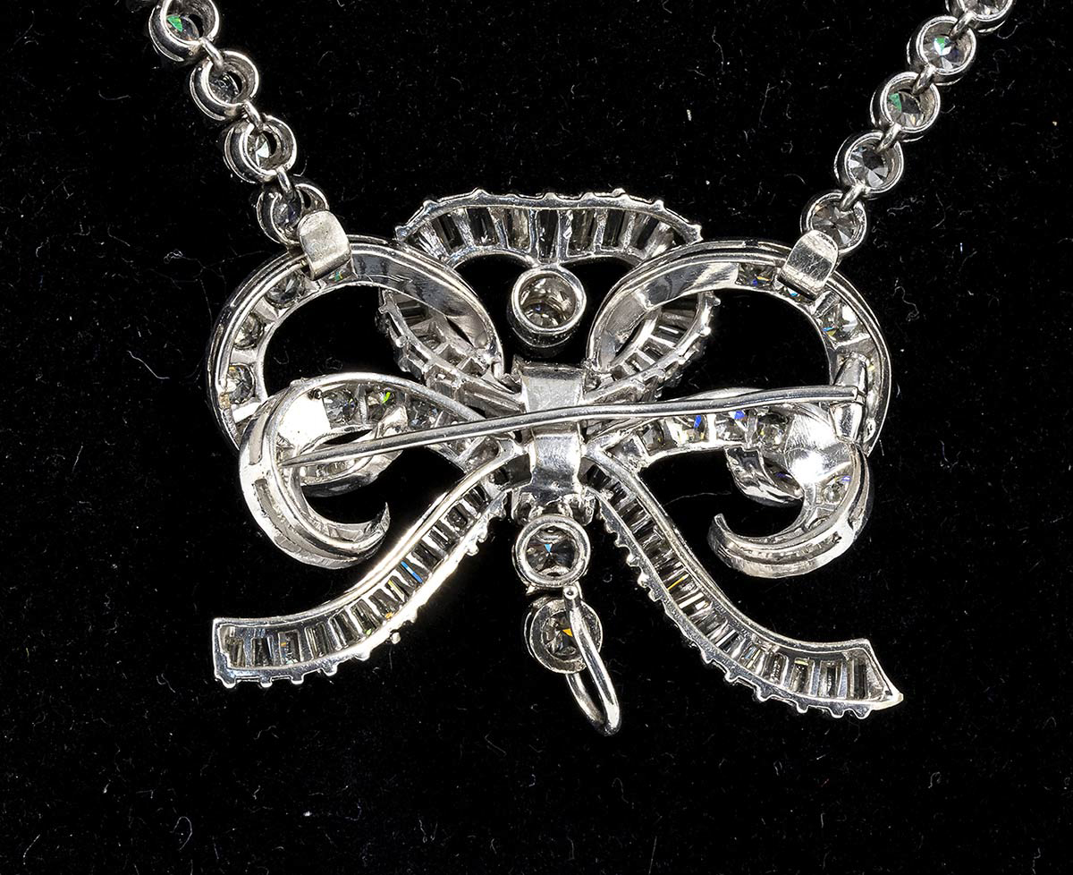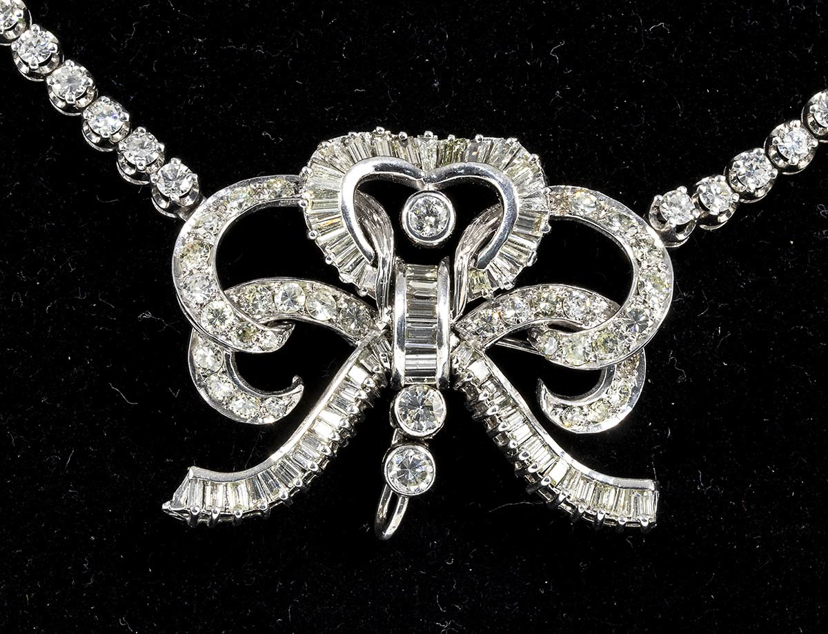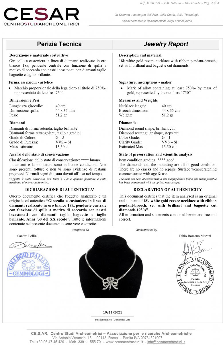 oro bianco 18k, girocollo a castoniera in linea di diamanti, pendente centrale con funzione di spilla a motivo di coccarda, nastri incastonati con diamanti taglio baguette e taglio brillante 13,50 ct circa, G-J, purezza VVS-SI.