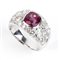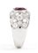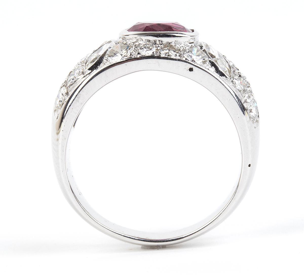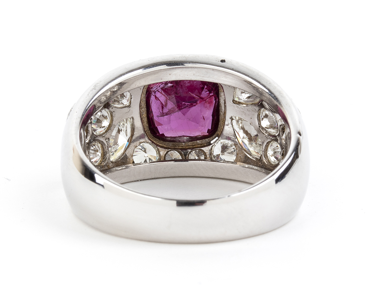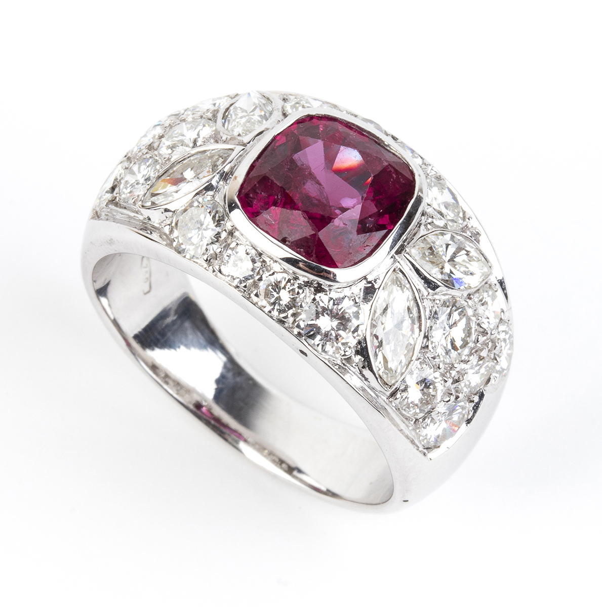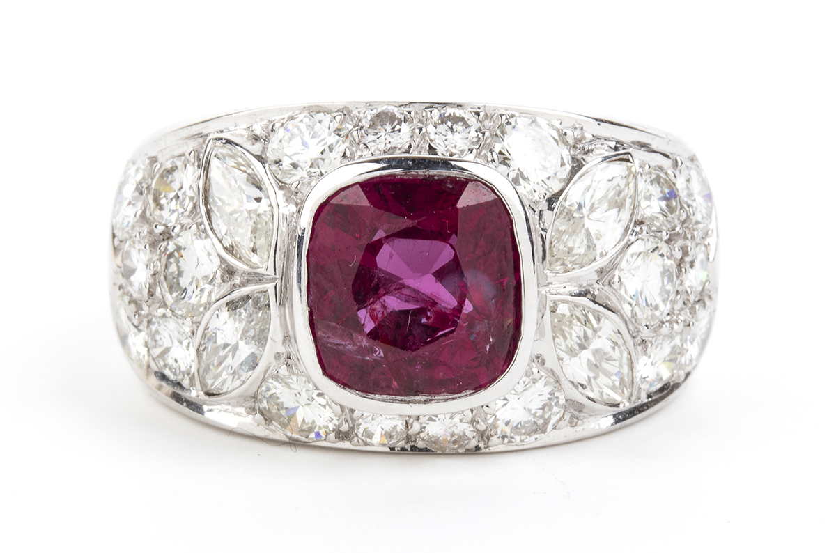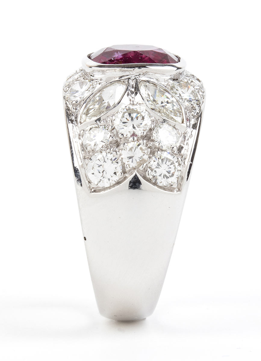 oro bianco 18k, modellato come una fascia, incastonato con rubino 2,80 ct circa, contornato da pavé di diamanti taglio brillante e taglio navetta 3,00 ct F-G, IF-VVS.