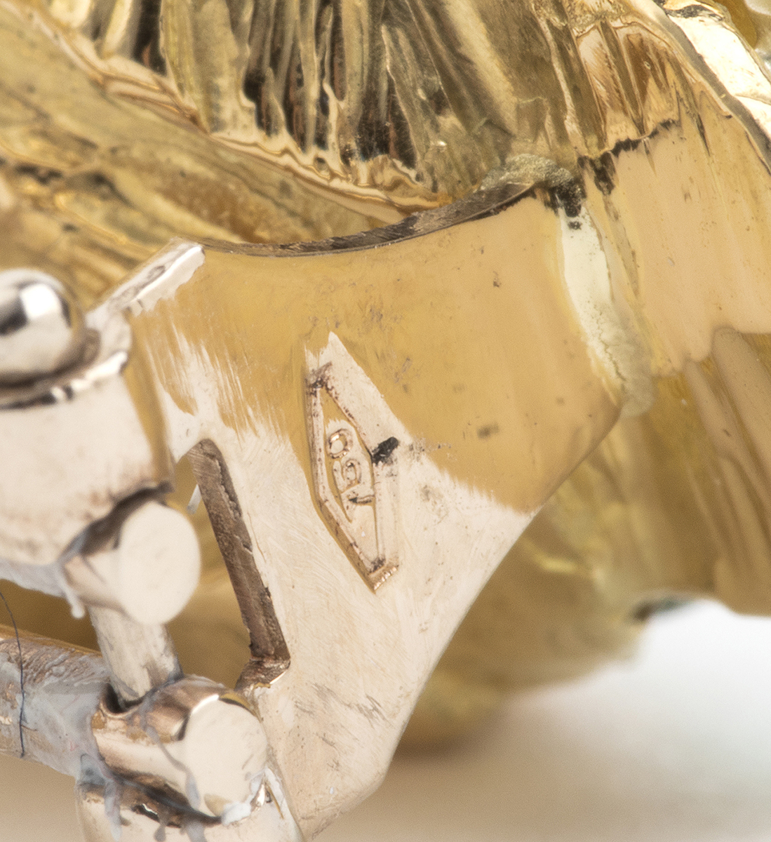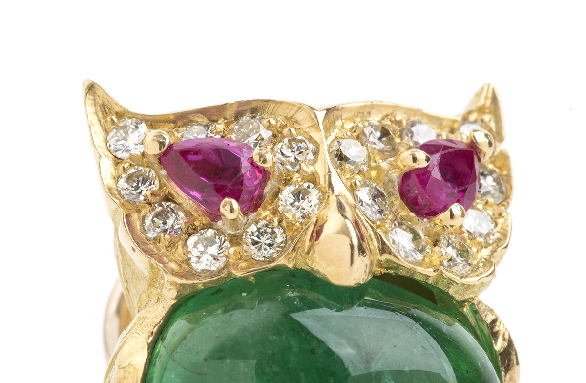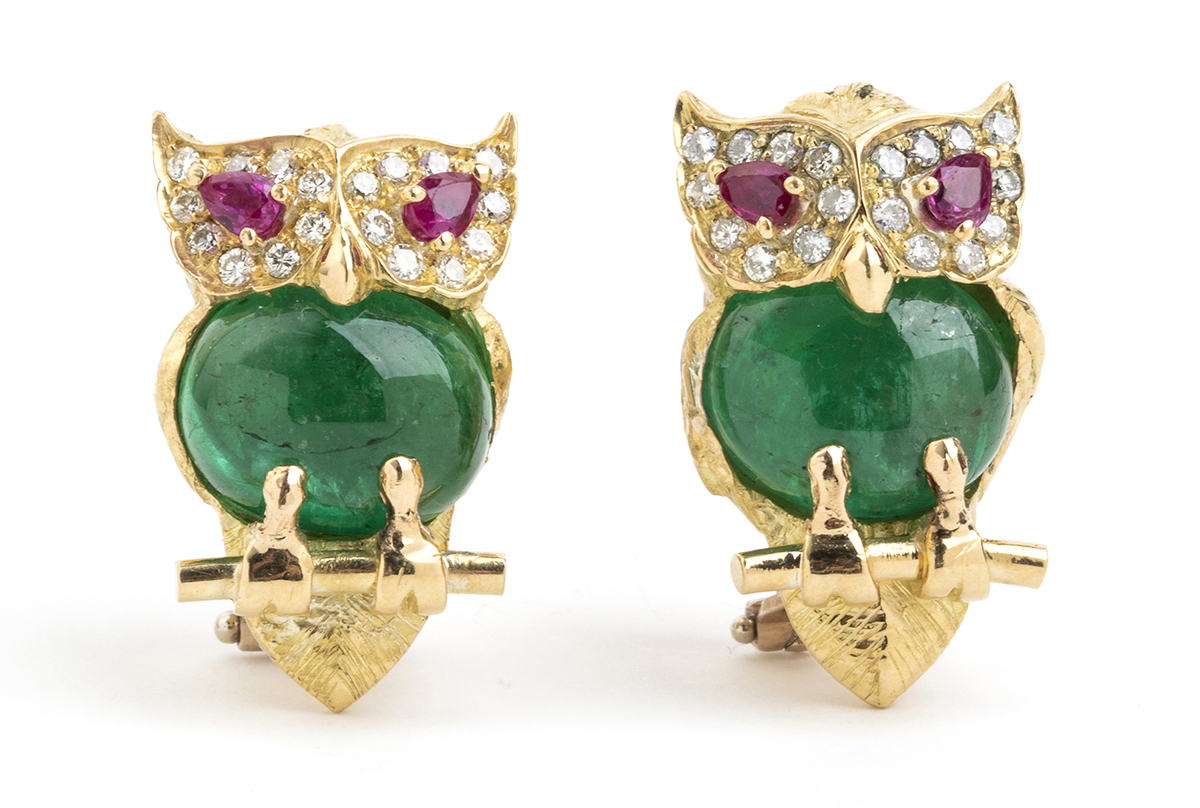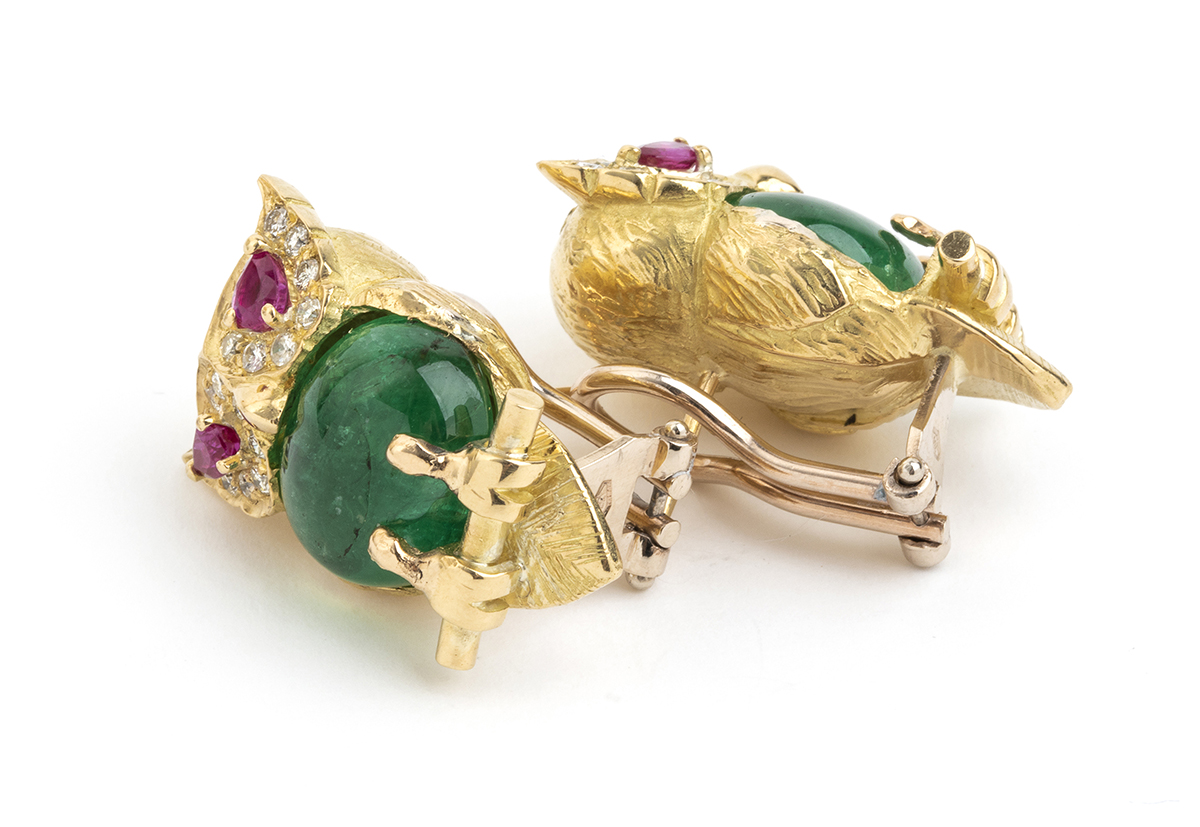Paio di orecchini raffiguranti un gufo in smeraldo rubini e diamanti