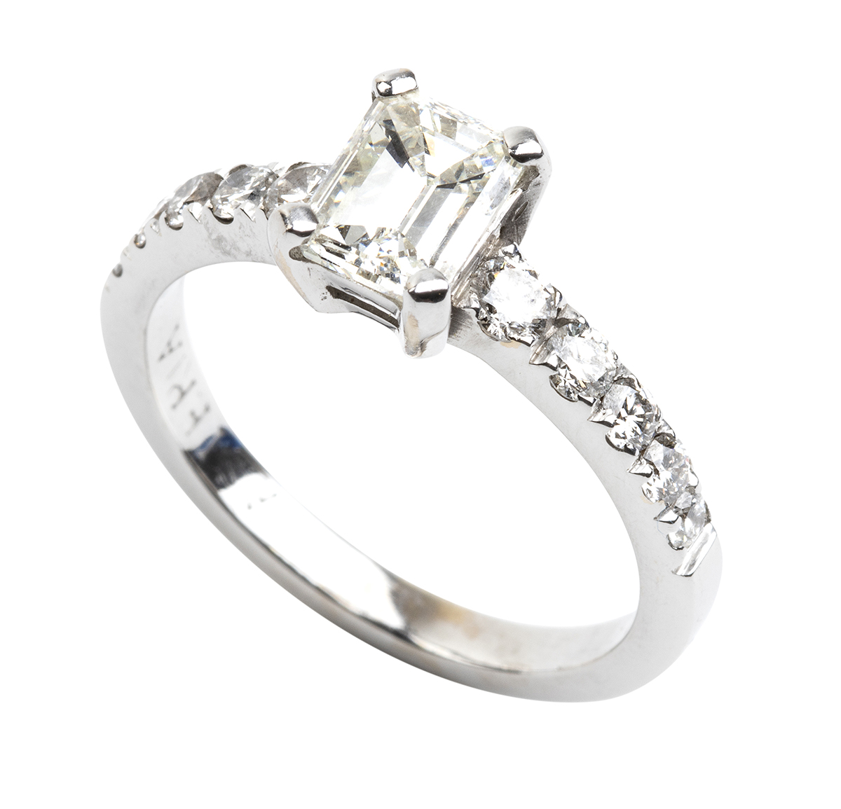 Anello in oro con diamante taglio smeraldo e diamanti taglio brillante