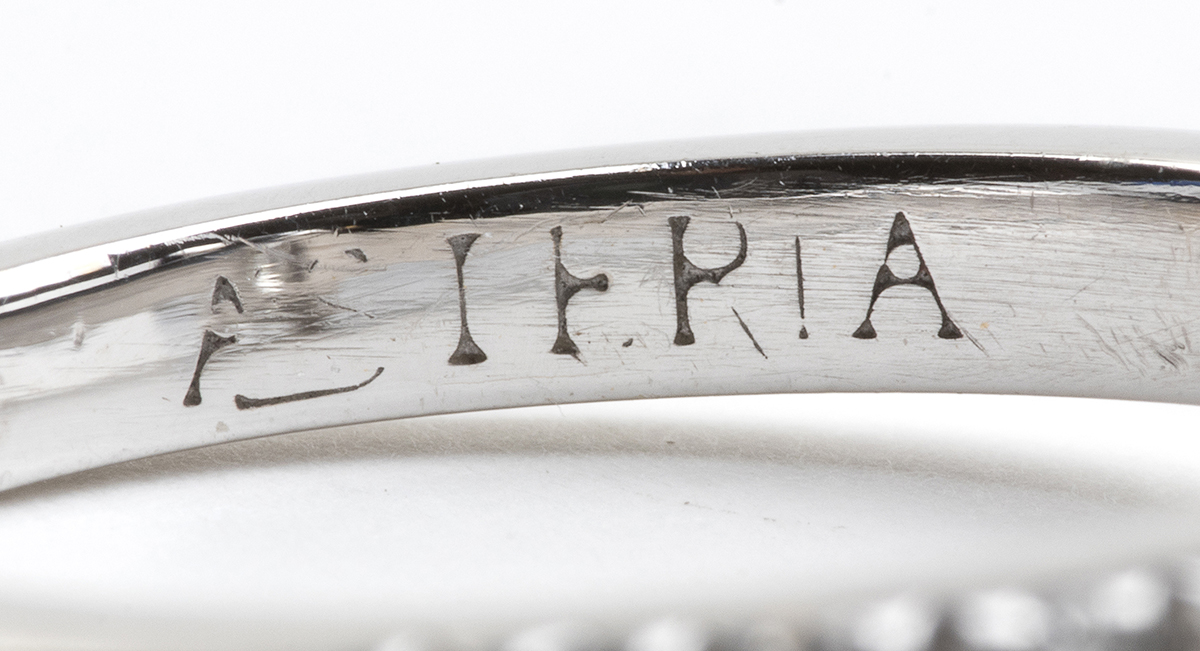 oro bianco 18k, incastonato con diamante centrale 1,00 ct circa, G-H, VVS, affiancato da diamanti taglio brillante 0,30 ct circa F-G, VVS-VS.