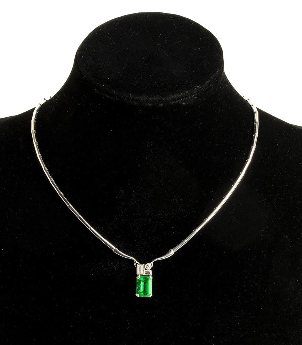 oro bianco 18k, incastonato con smeraldo colombiano taglio ottagonale 3,60 ct circa e diamanti taglio brillante 0,40 ct circa, F-G, VVS.