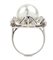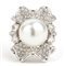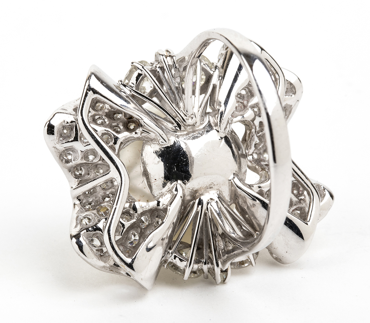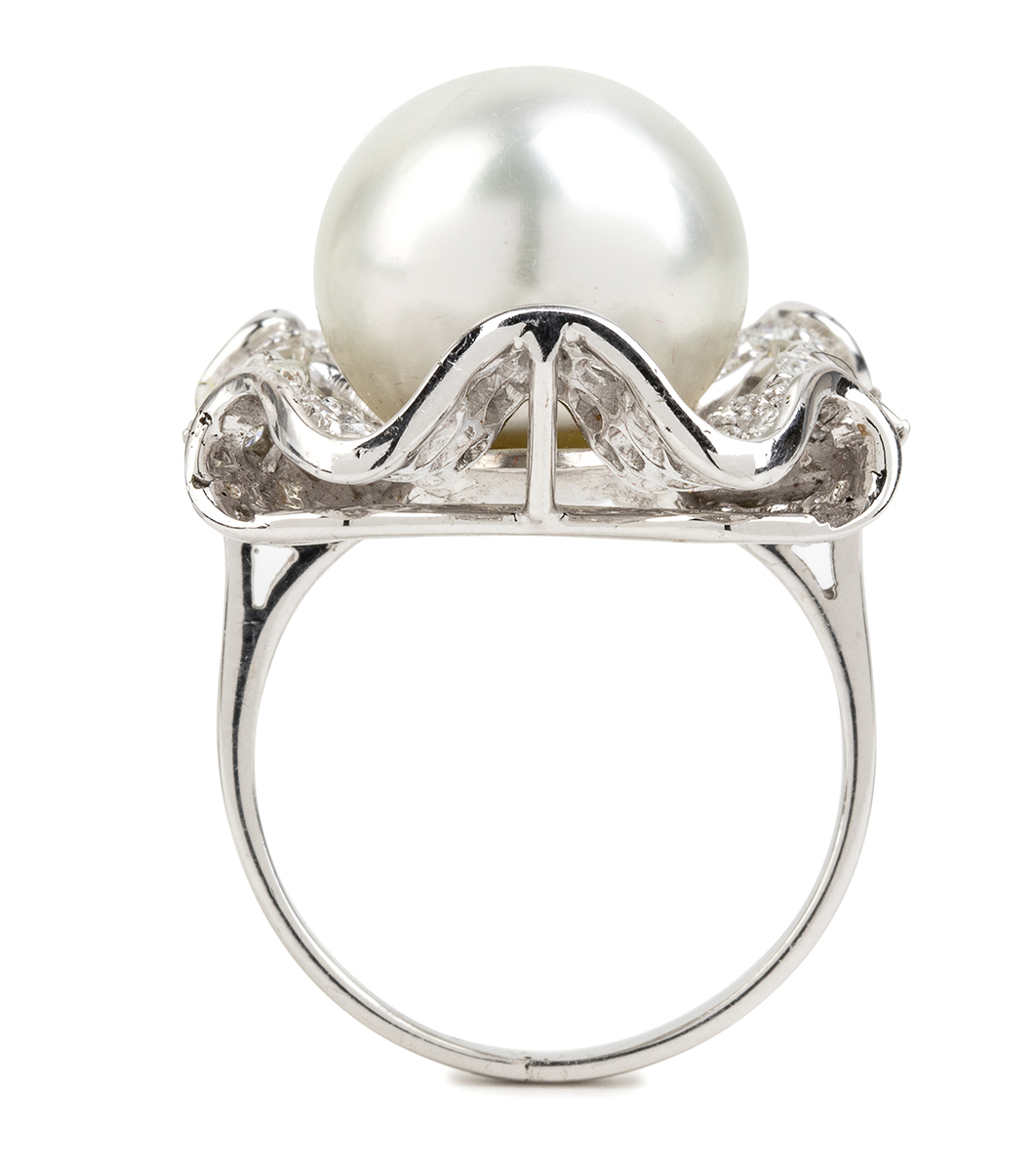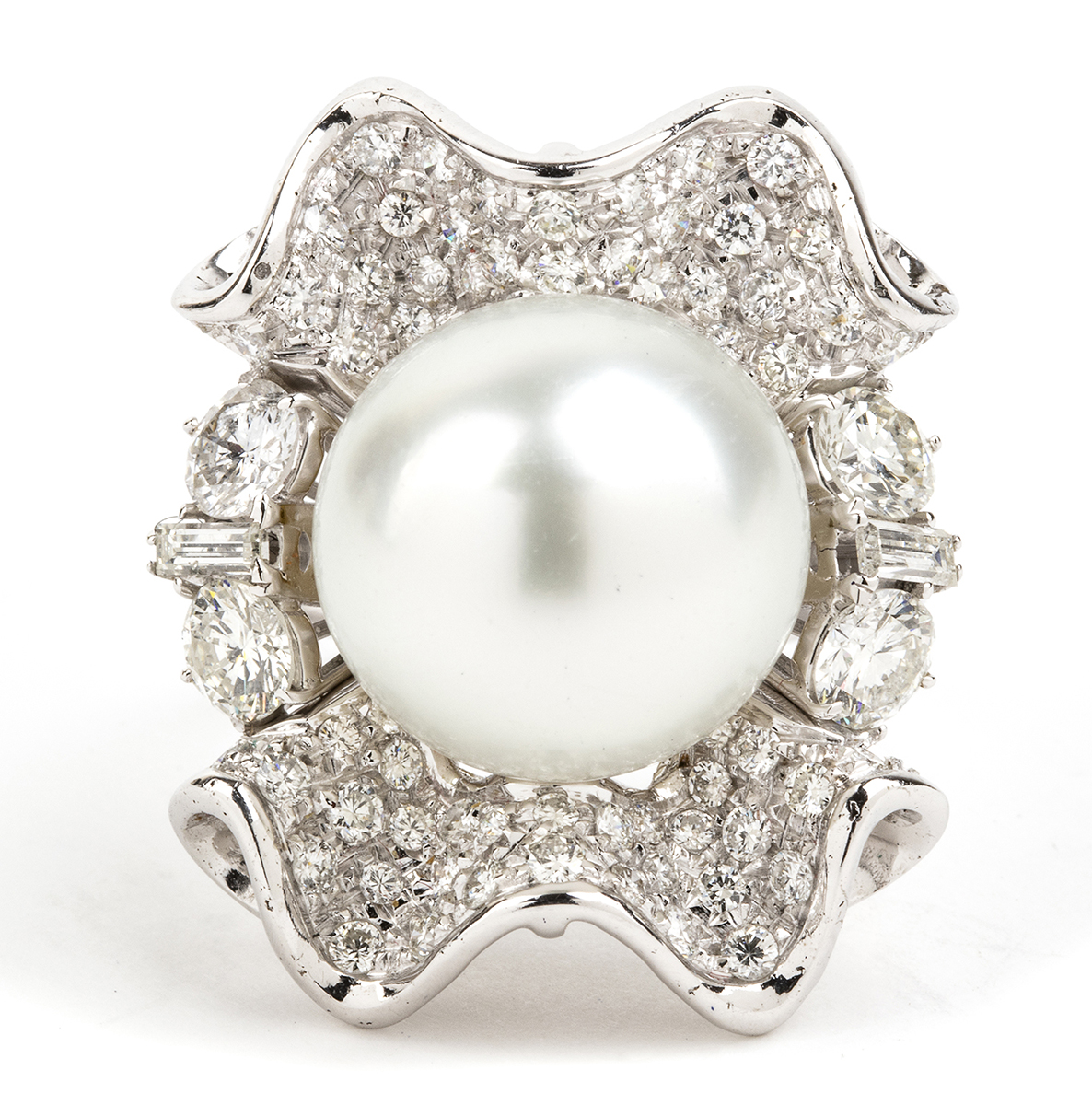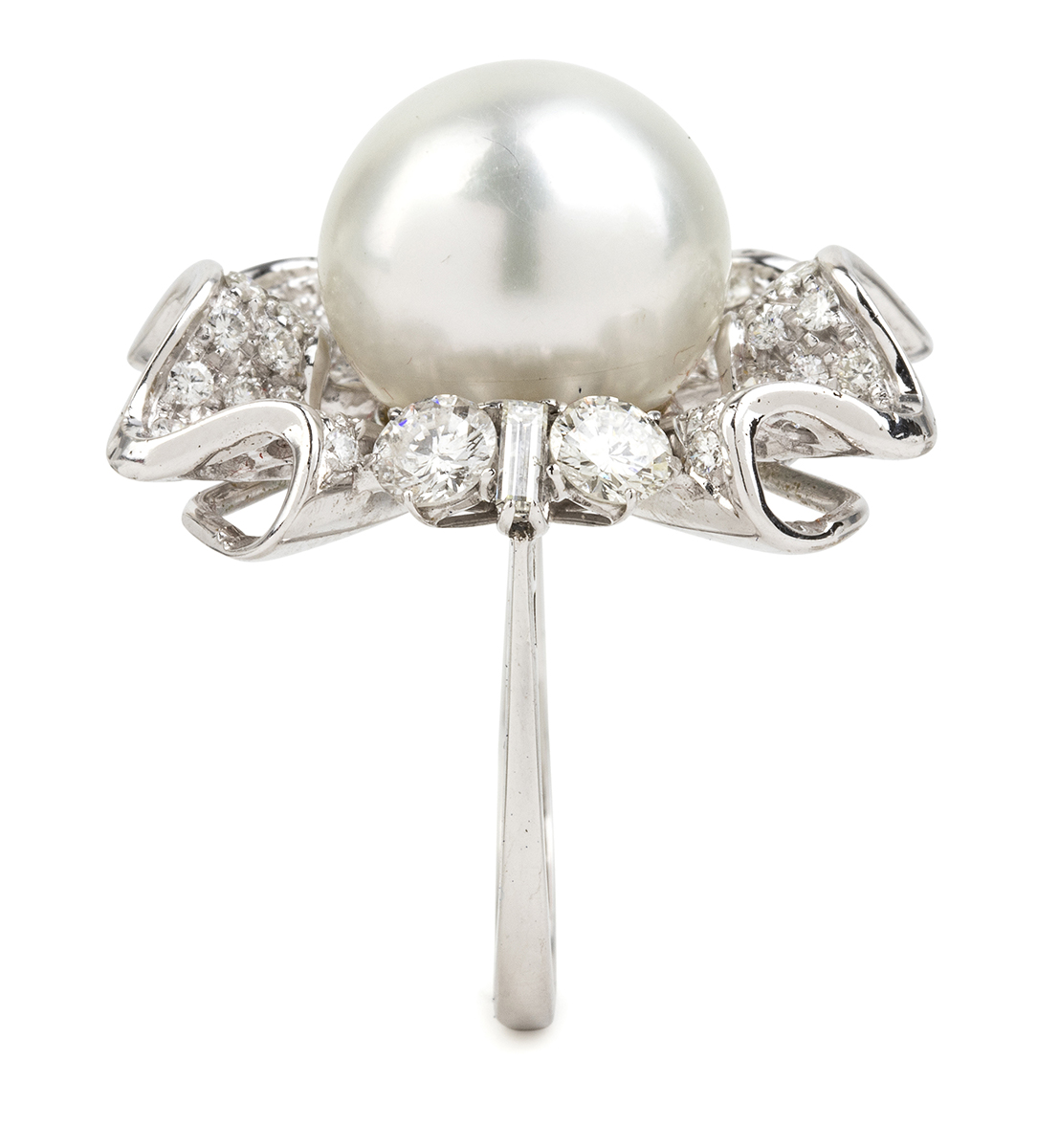 oro bianco 18k, con perla australiana contornata da motivo di nastri in pavé di diamanti. Diametro perla 13 - 13,5 mm. Diamanti taglio baguette e taglio brillante 2,00 ct circa F-G, VVS-VS.