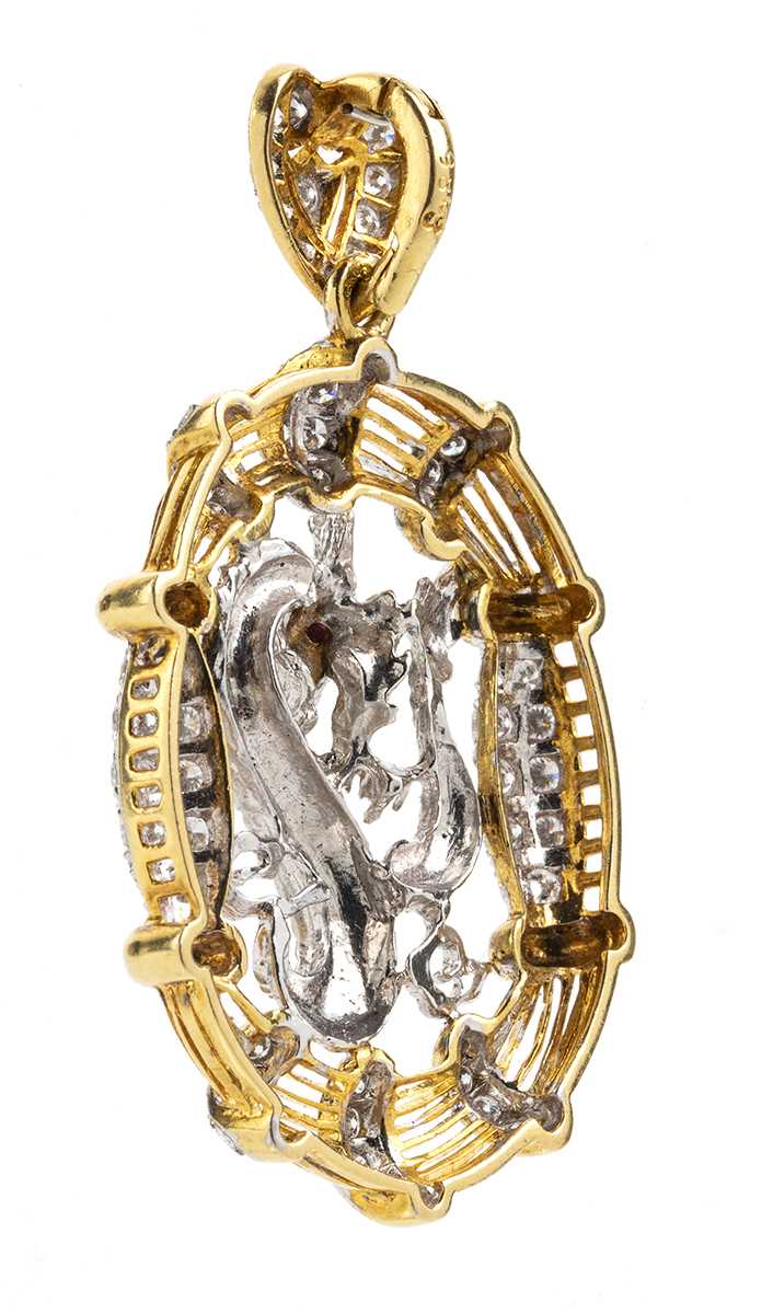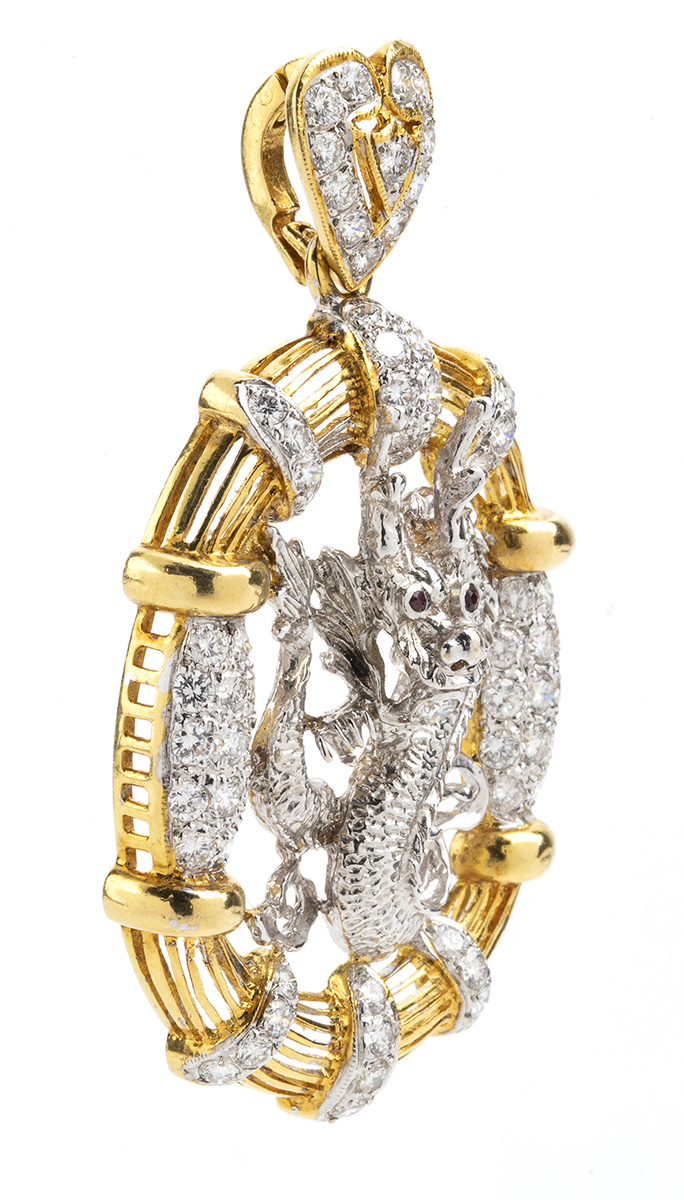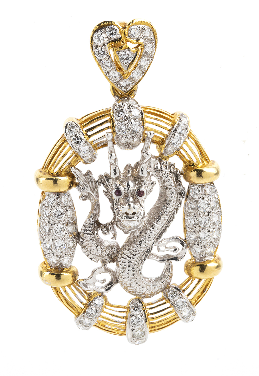 oro bianco ed oro giallo 18k, raffigurante un drago al'interno di una cornice, dettagli in diamanti taglio brillante 1,40 ct circa, G-H, VS.