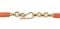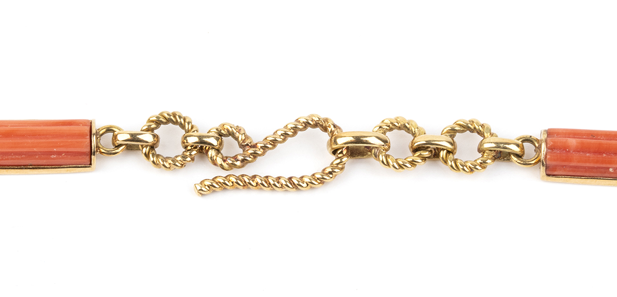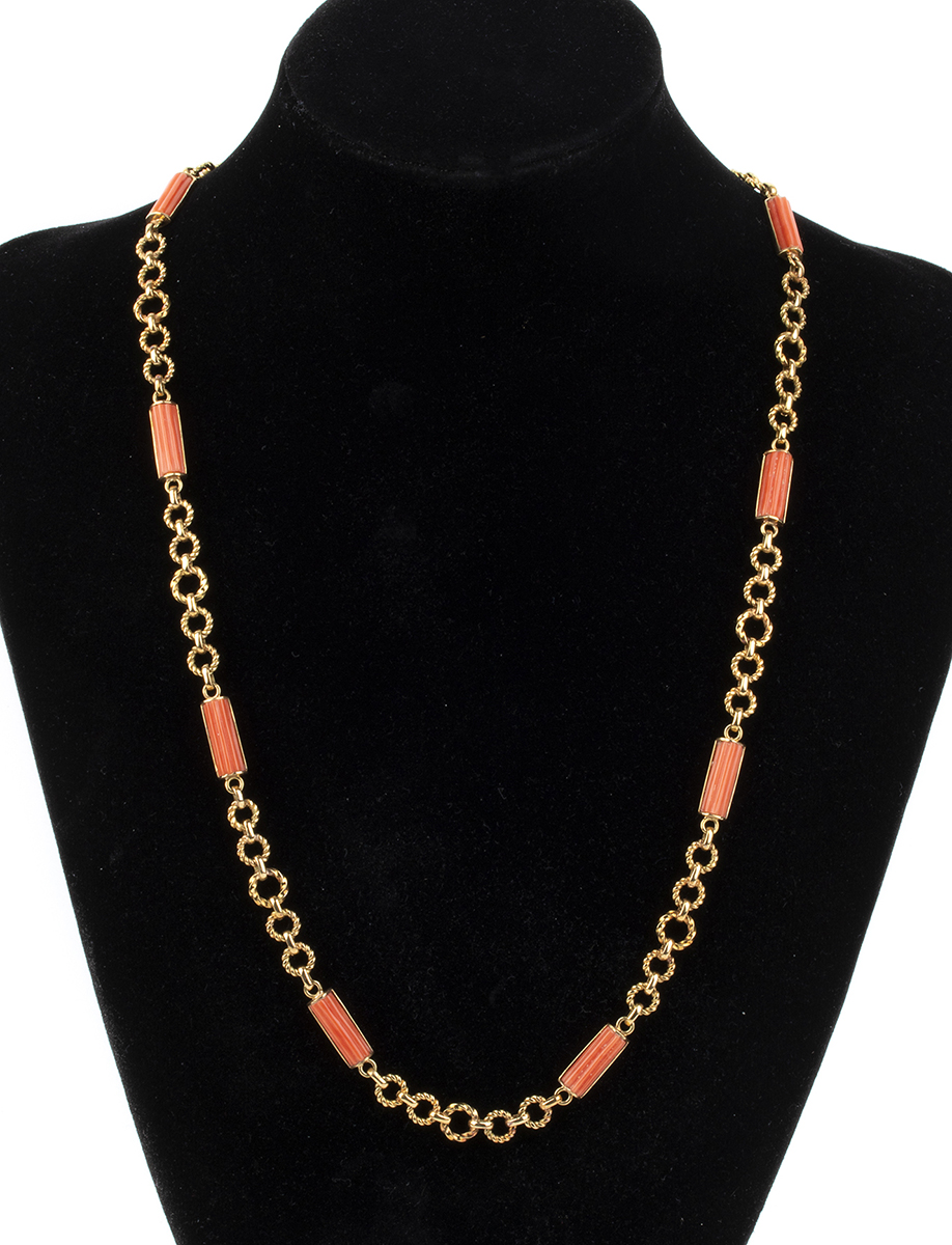 oro giallo ed 18k, catena in maglie ad anelli ritorti interrotta da elementi in corallo cerasuollo incisi (corallium elatius). Punzonato "750".