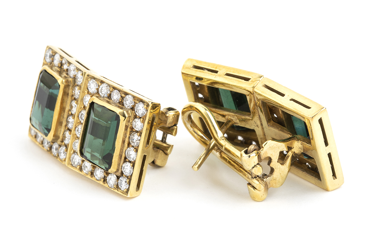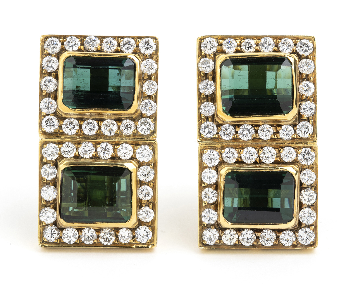 oro giallo 18k, ciascuno incastonato con coppia di tormaline contornate da diamanti taglio brillante 2,20 ct circa, G-H, VVS.
