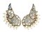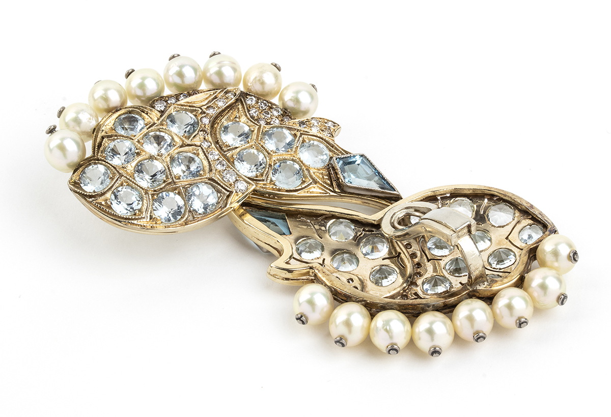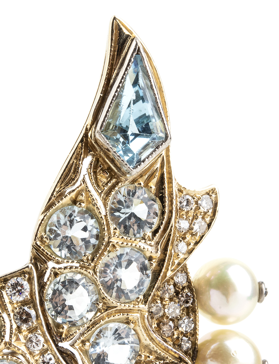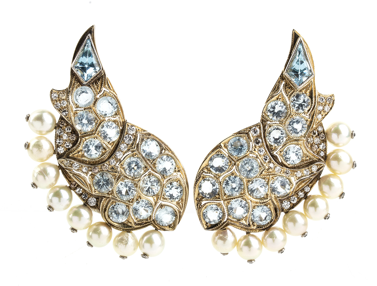 oro giallo ed oro bianco 18k, ciascuno con motivo a foglia profilato da perle coltivate d'acqua salata, incastonato con topazi azzurri, diamanti taglio brillante e taglio huit-huit 0,60 ct circa, H, VS. Dimensioni 50 x 33 mm circa. Peso 32,6 gr circa.