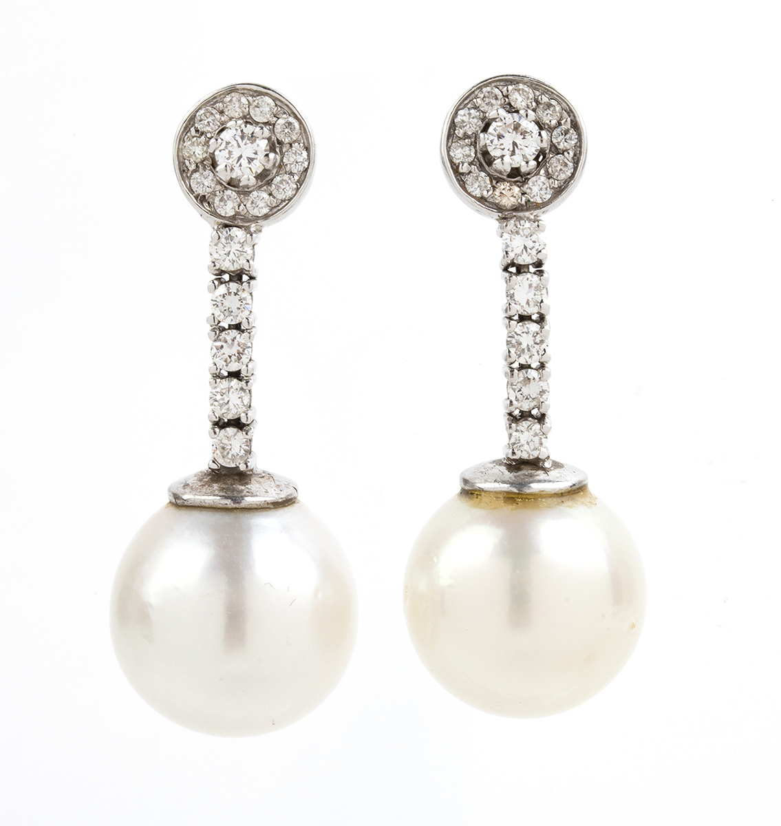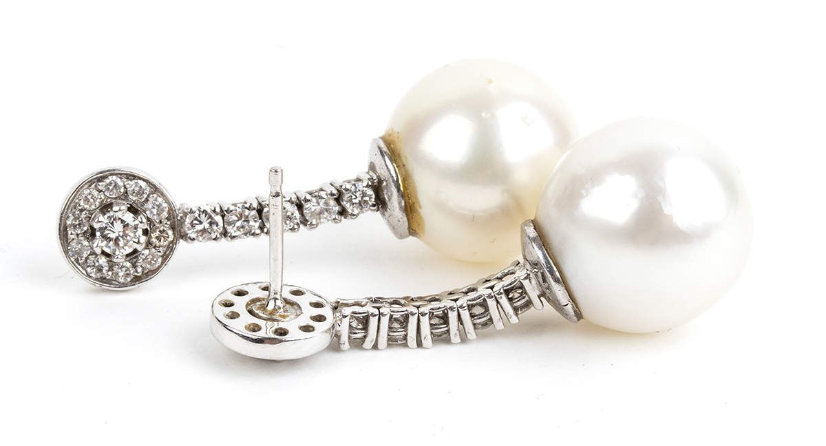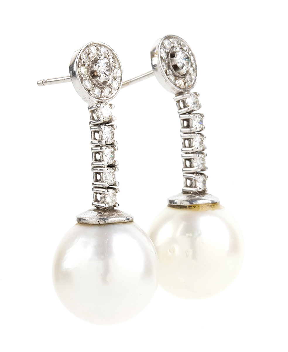 Lotto 123 | Orecchini pendenti in oro bianco, diamanti e perle australiane