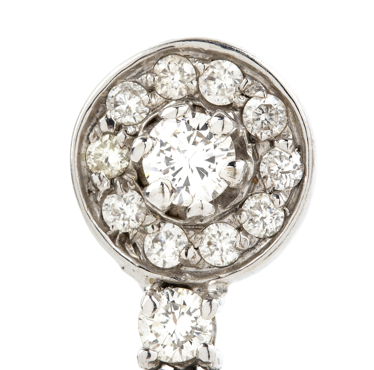 oro bianco 18k, con perla australiana diametro 14 - 14,5 mm sormontata da diamanti taglio brillante 1,15 ct circa, F-G, VVS. Lunghezza 40 mm circa. Peso 12,7 gr circa.