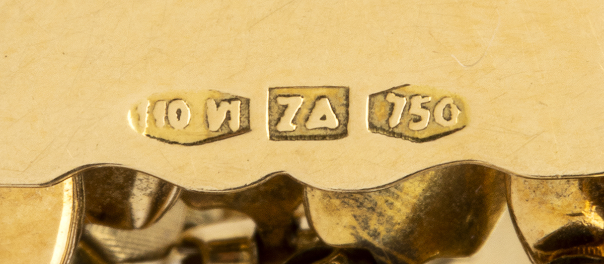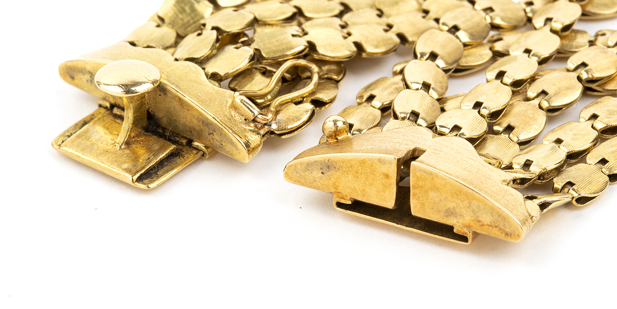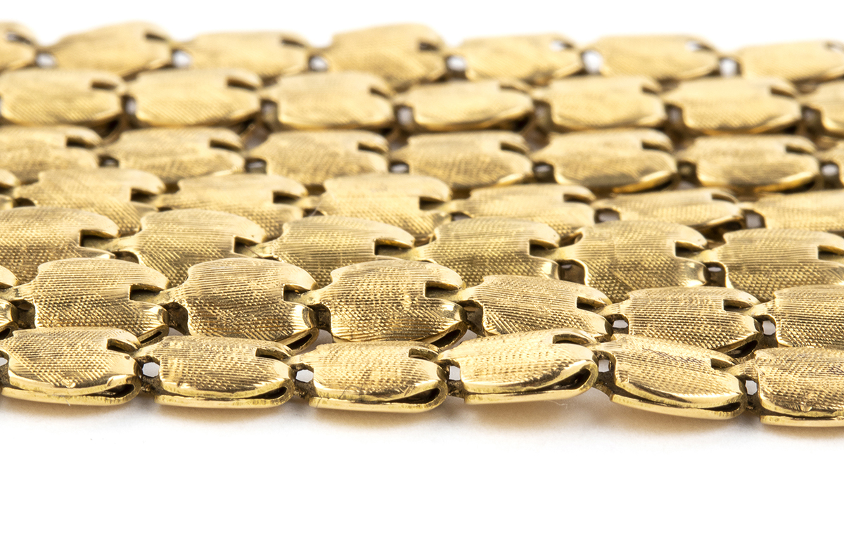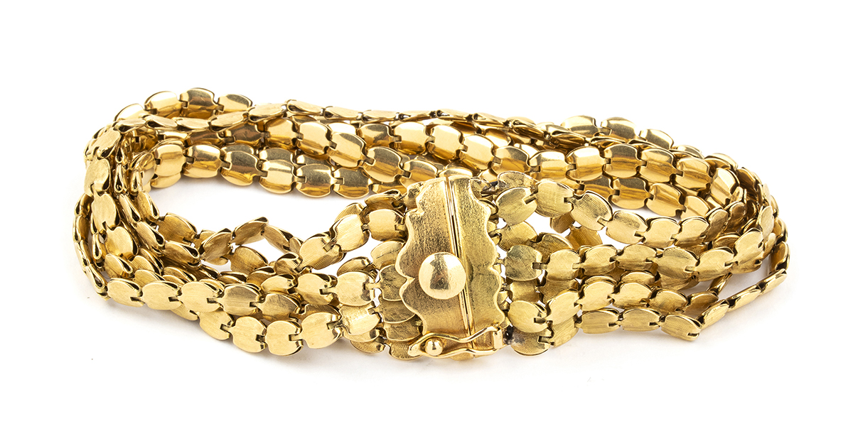 oro giallo 18k, a sette fili di maglie fantasia. Punzonato "750 -110 VI".