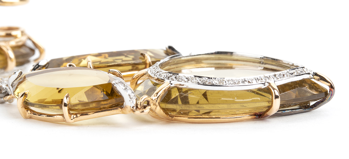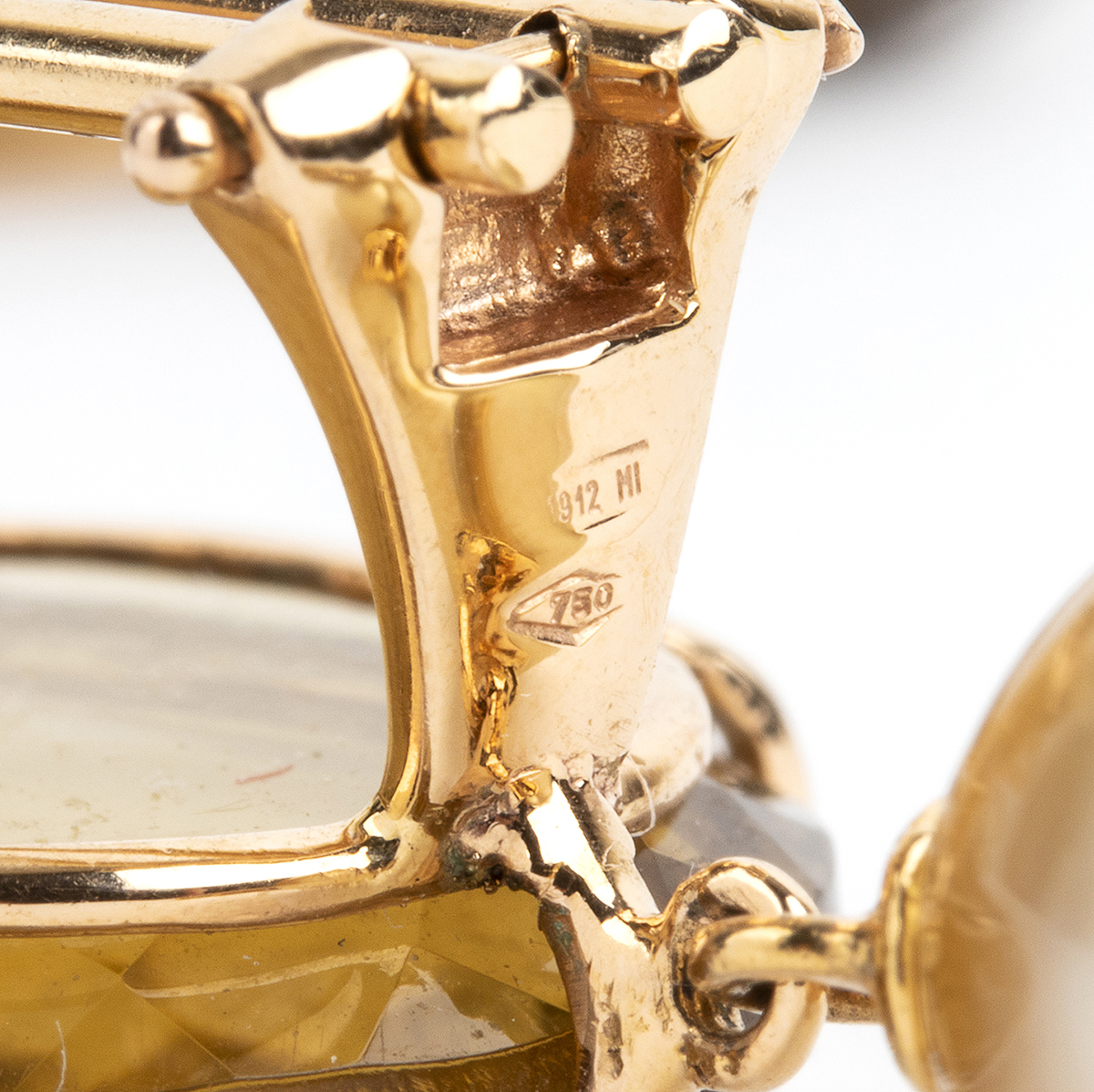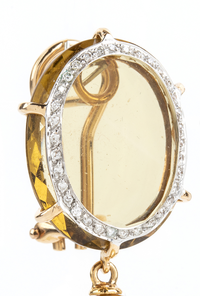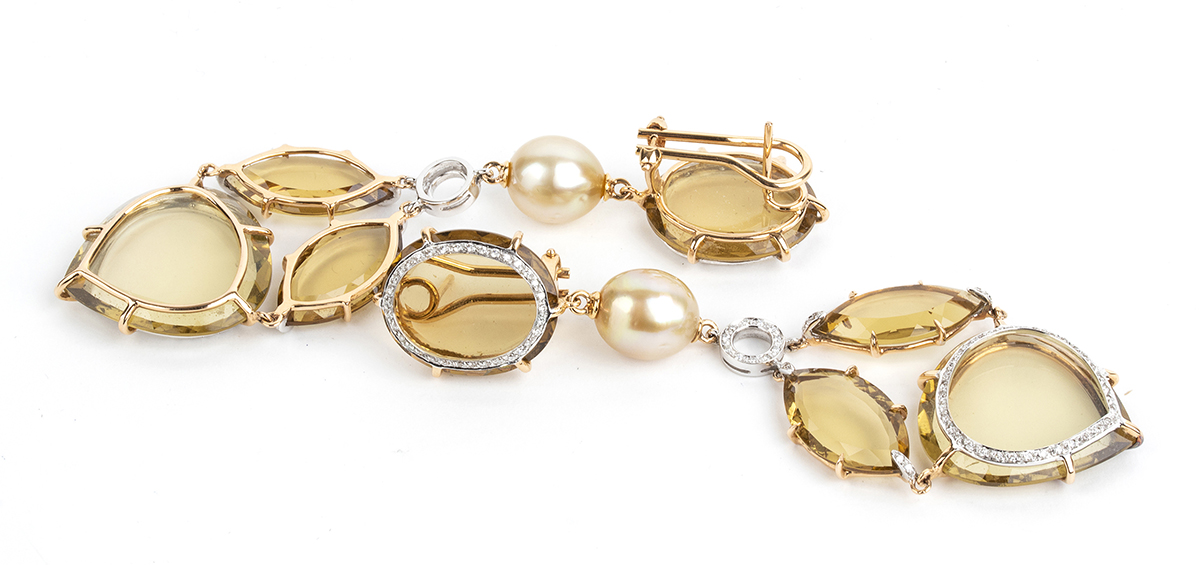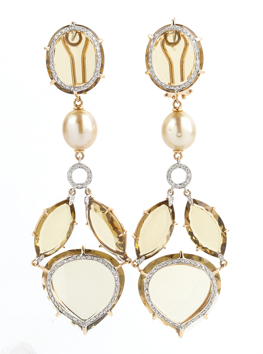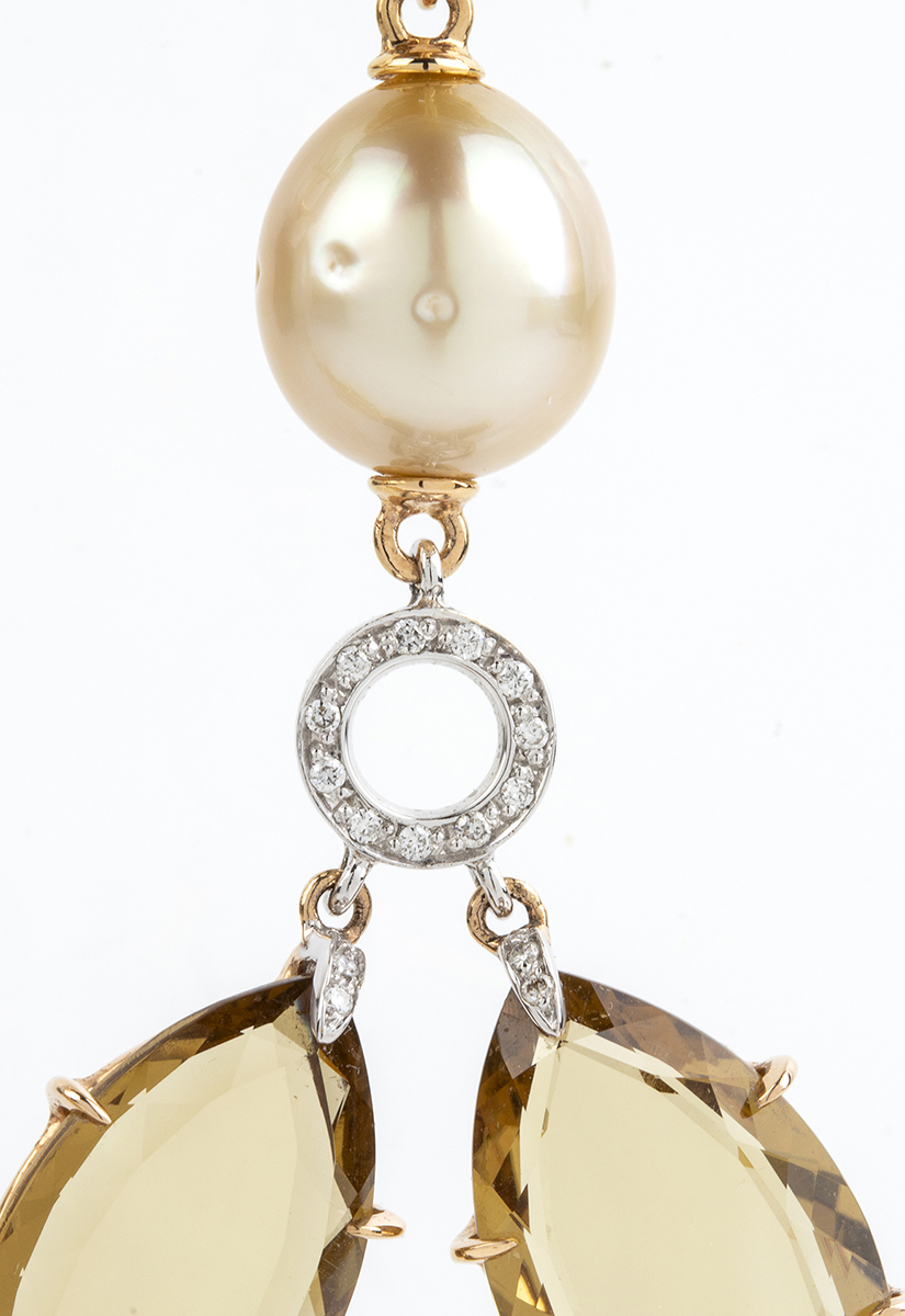Paio di orecchini pendenti con perle di fiume, quarzi citrini e diamanti