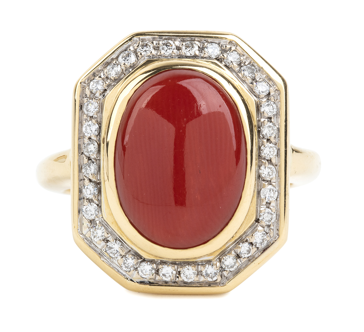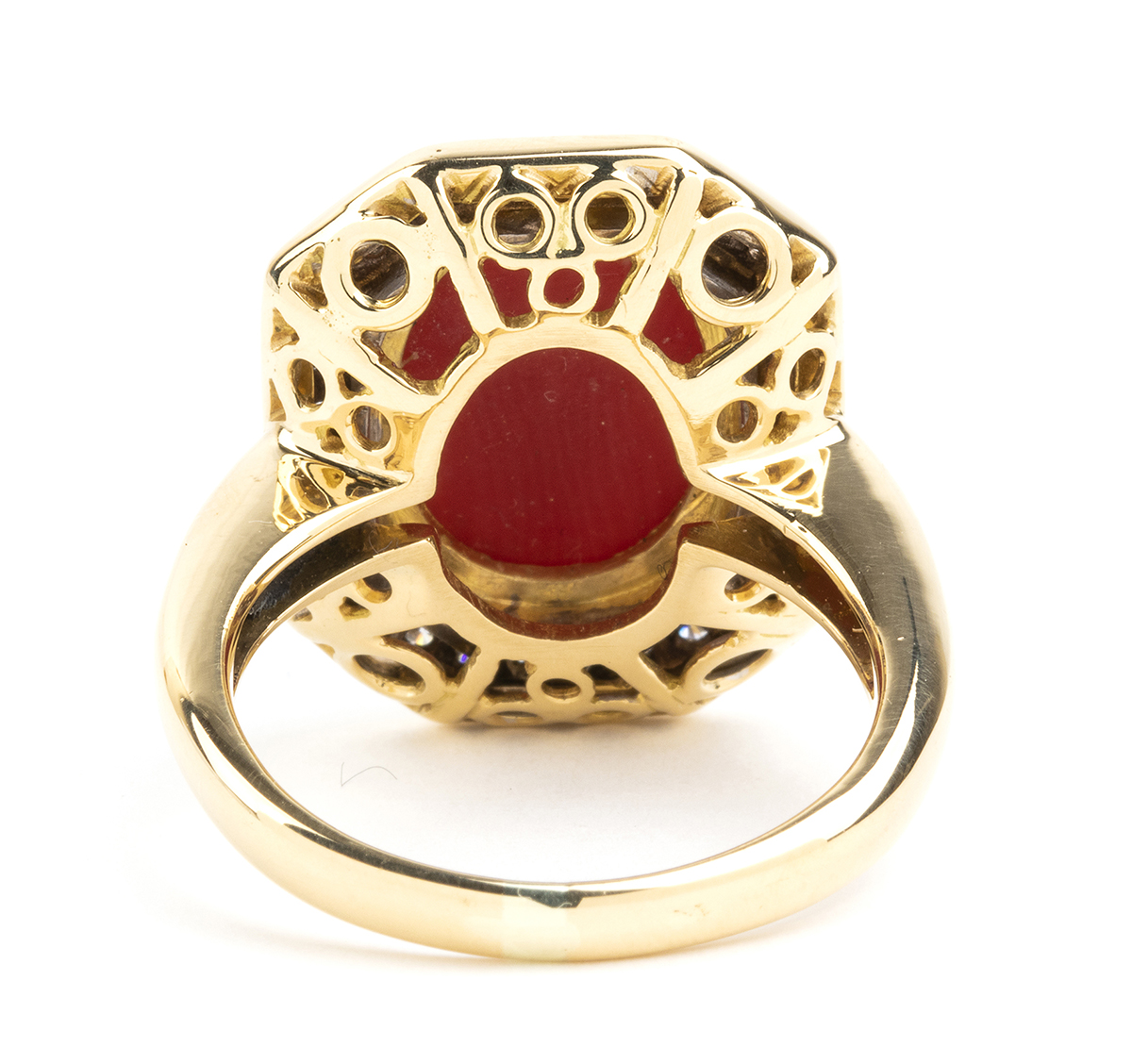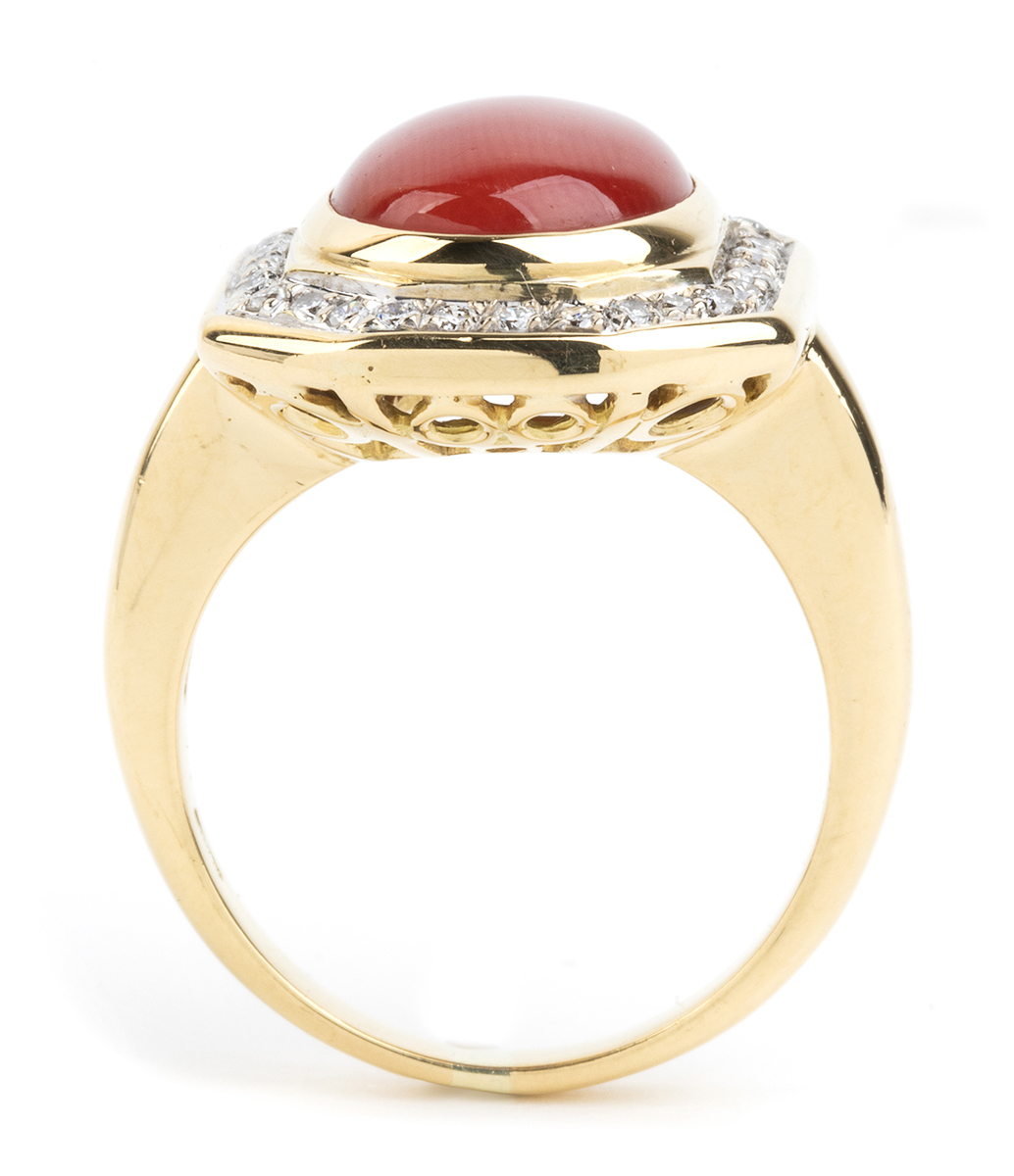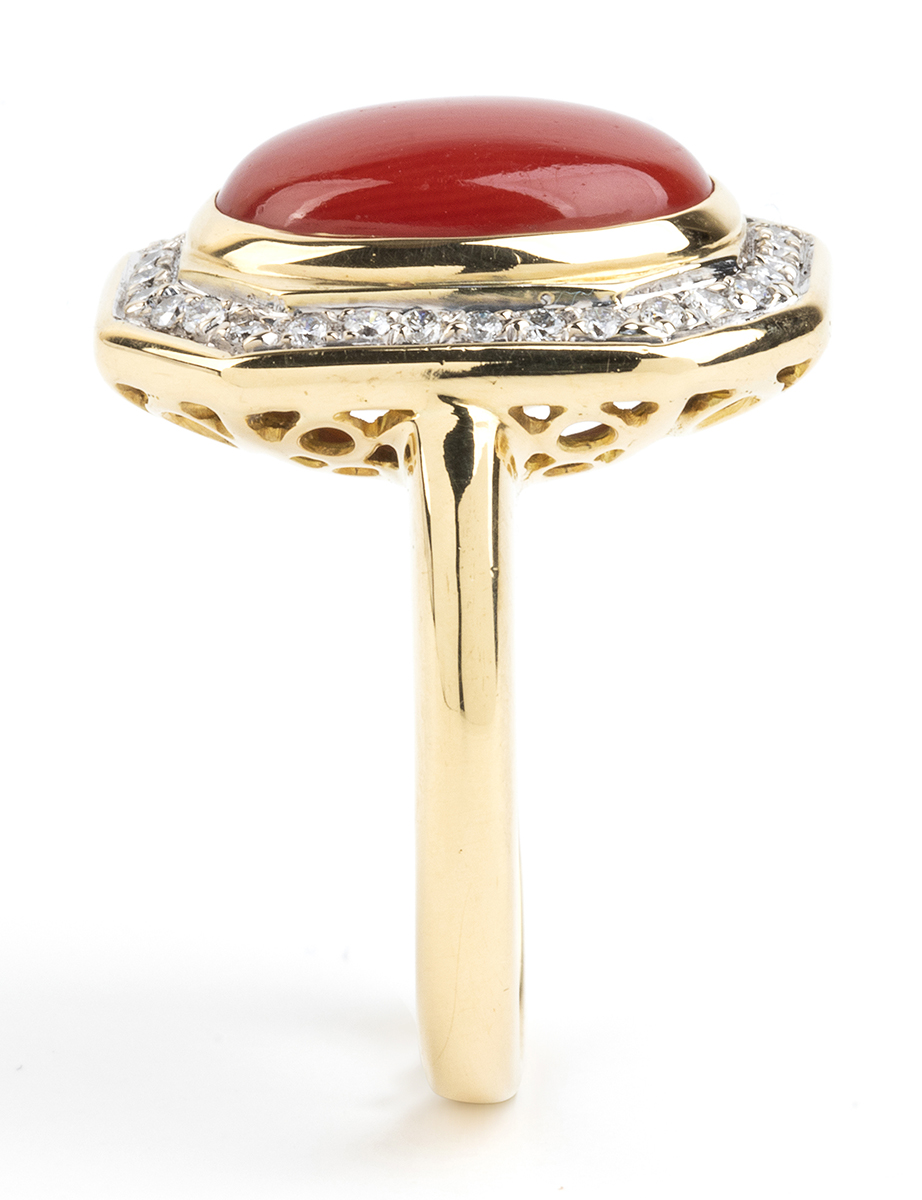 Anello in oro giallo con corallo cerasuolo e diamanti