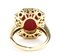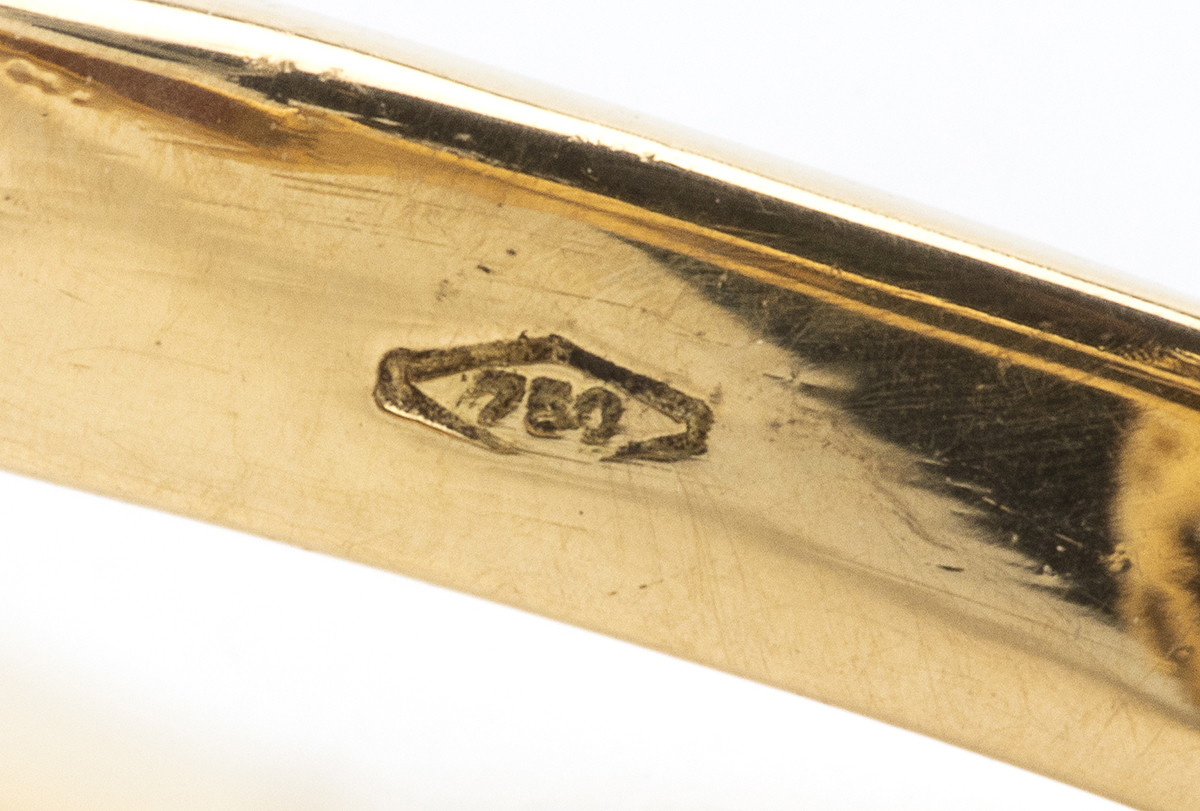oro giallo ed oro bianco 18k, incastonato con cabochon di corallo cerasuolo (corallium elatius) incorniciato da diamanti taglio brillante 0,32 ct circa, F-G, VVS-VS. Punzonato "750 - 3387 AL".