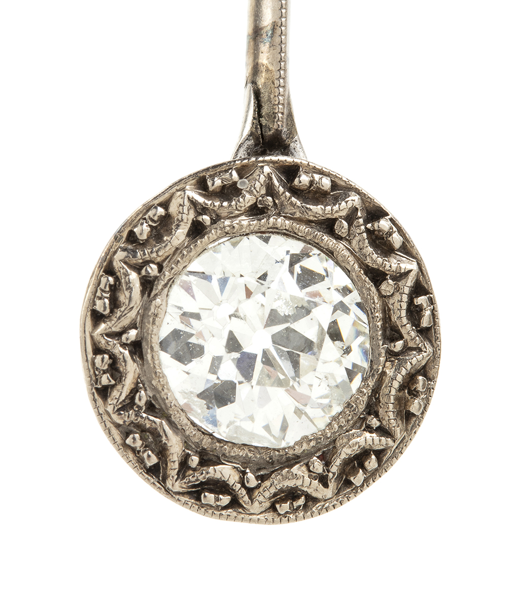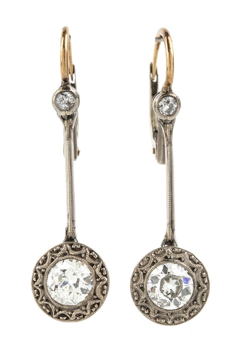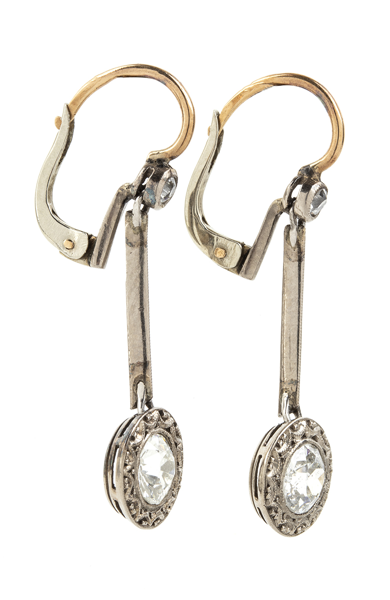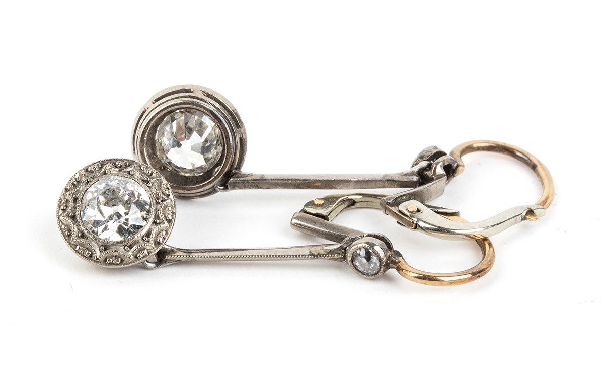oro bianco ed oro giallo 18k, ciascuno incastonato con diamanti di taglio vecchio europeo 1,50 ct circa.