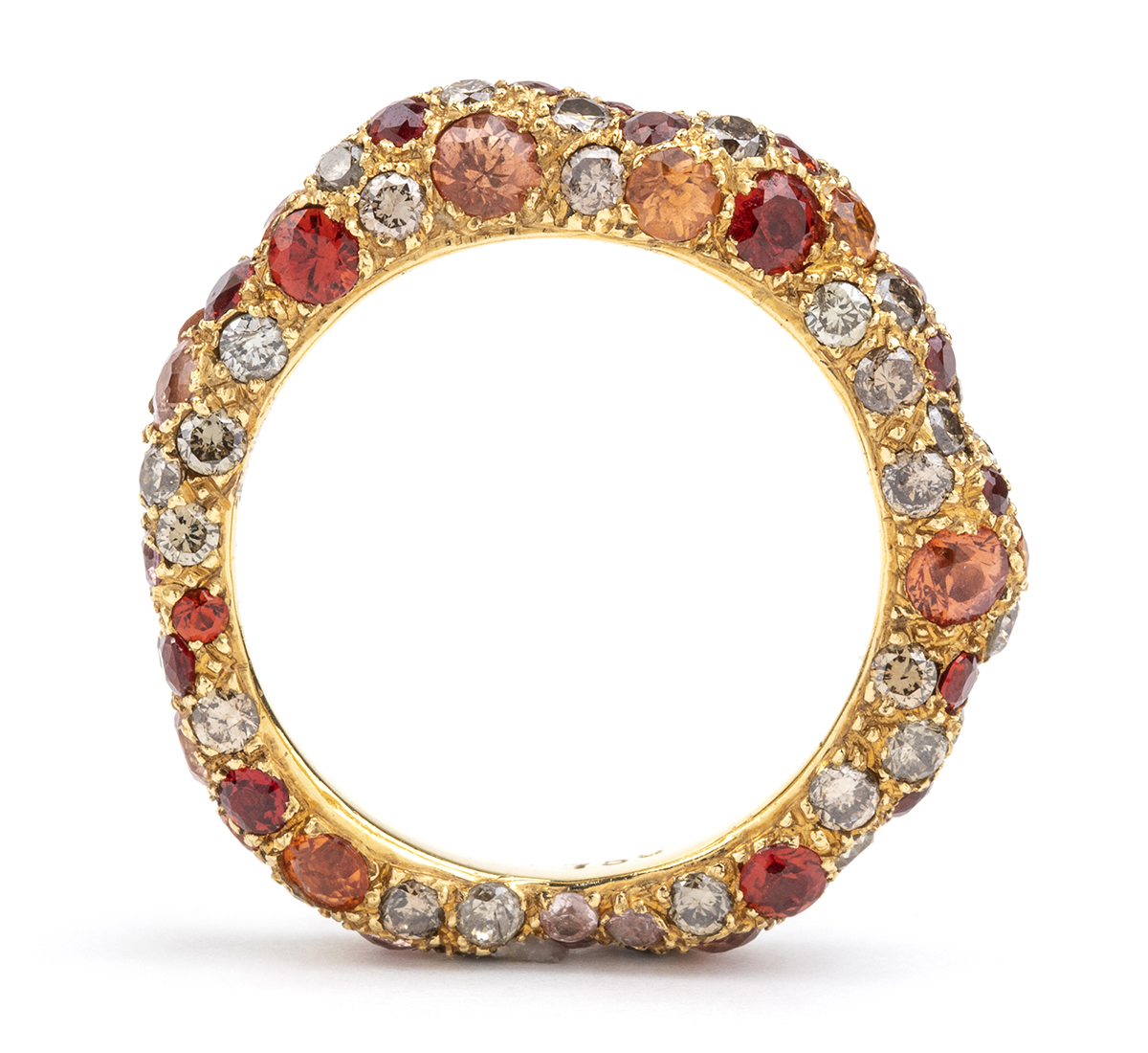 oro giallo 18k. Incastonato con diamanti brown, taglio brillante, 0,60 ct circa, tormaline e granati.