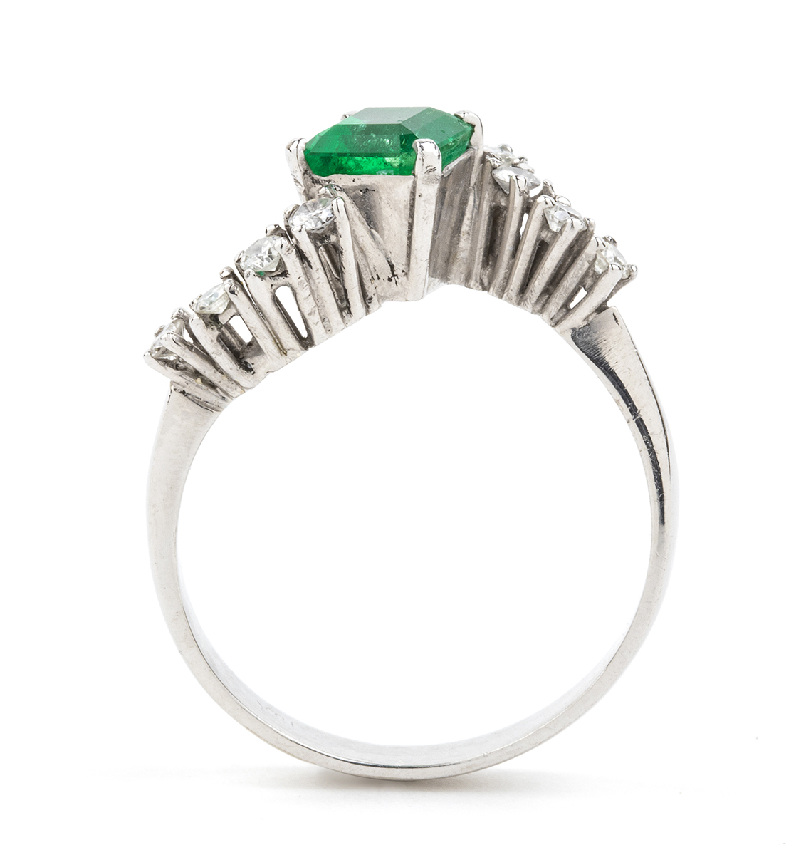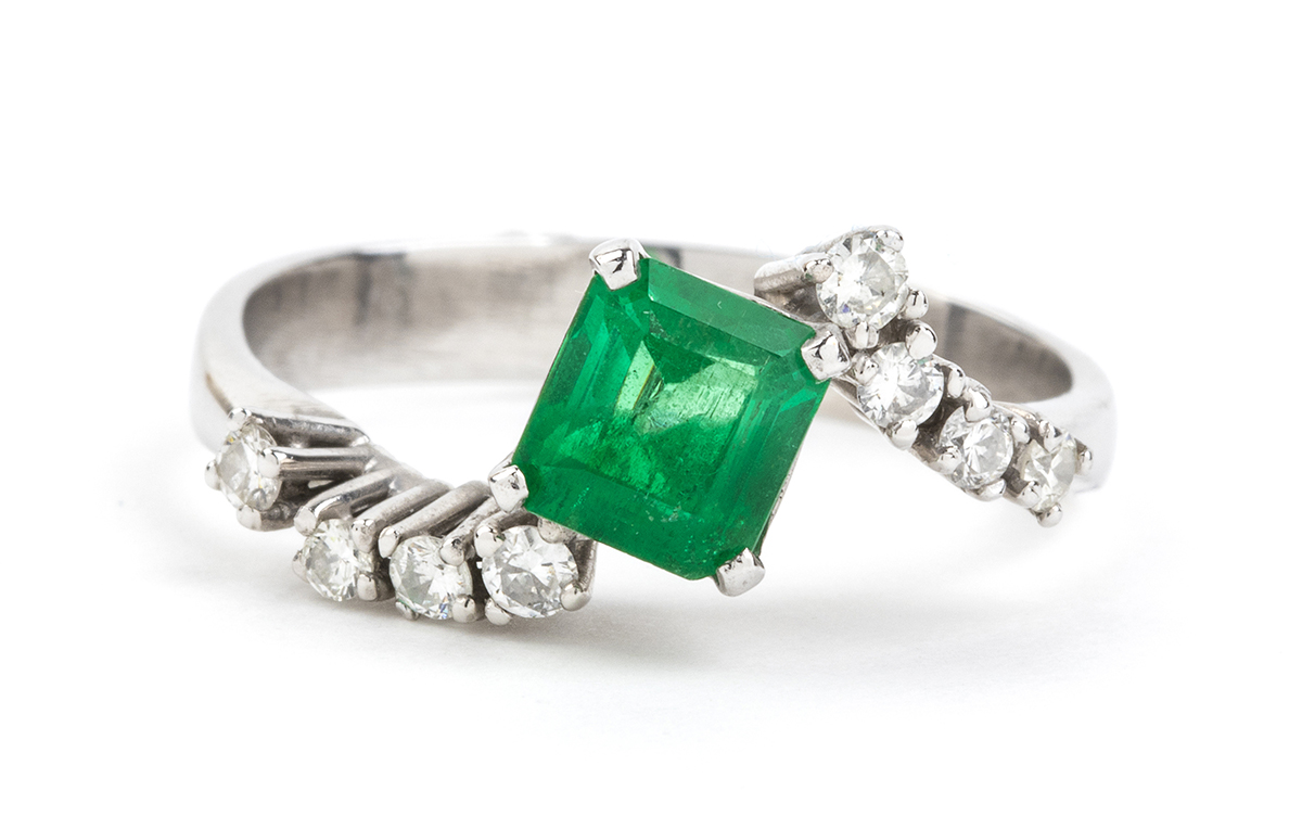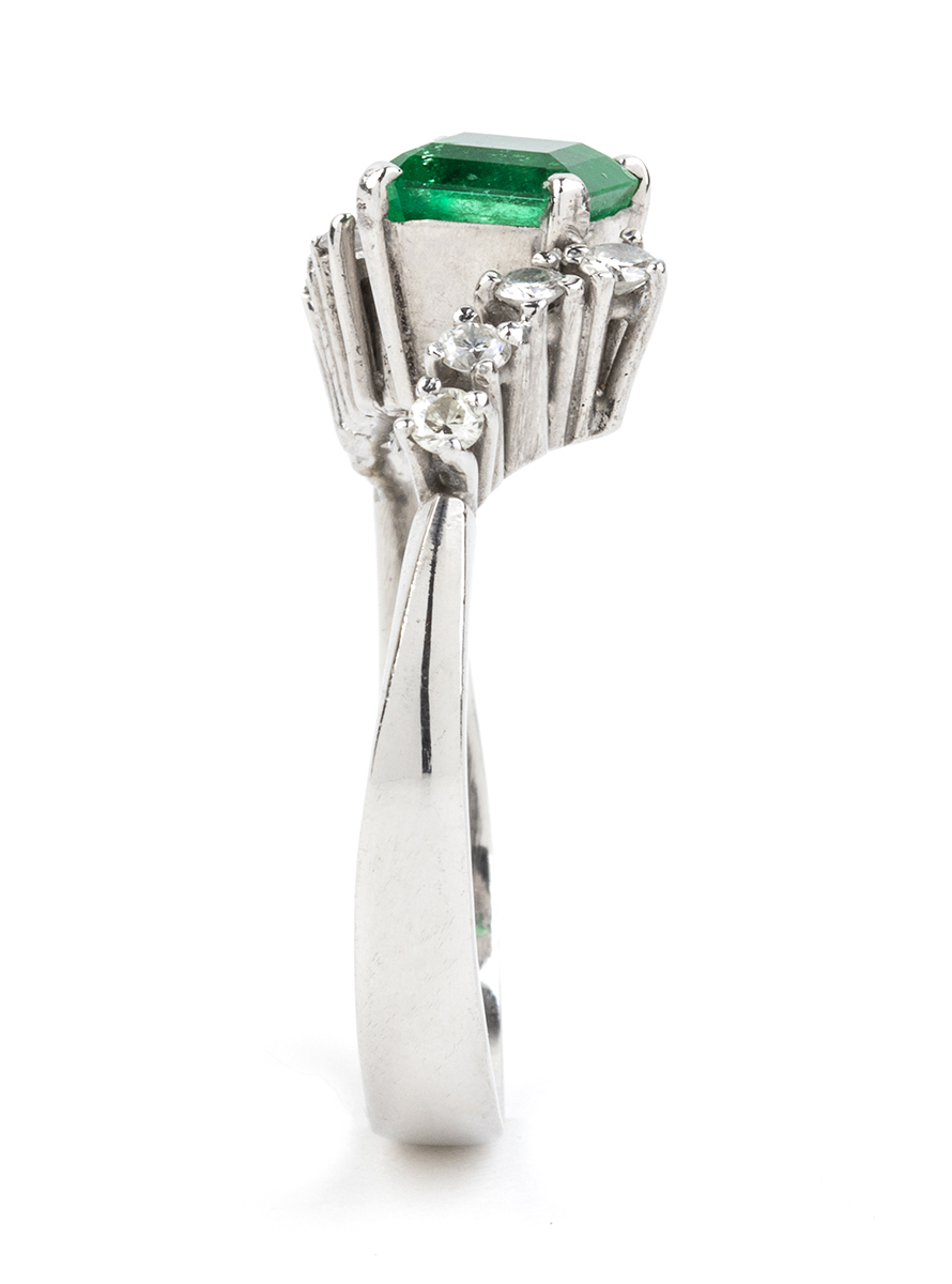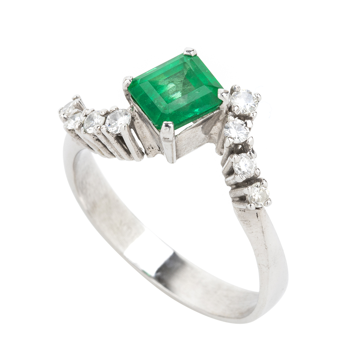 oro bianco 18k, incastonato con smeraldo 1,10 ct circa, affiancato da diamanti taglio brillante 0,35 ct circa, G-H, VVS-VS.
