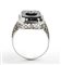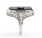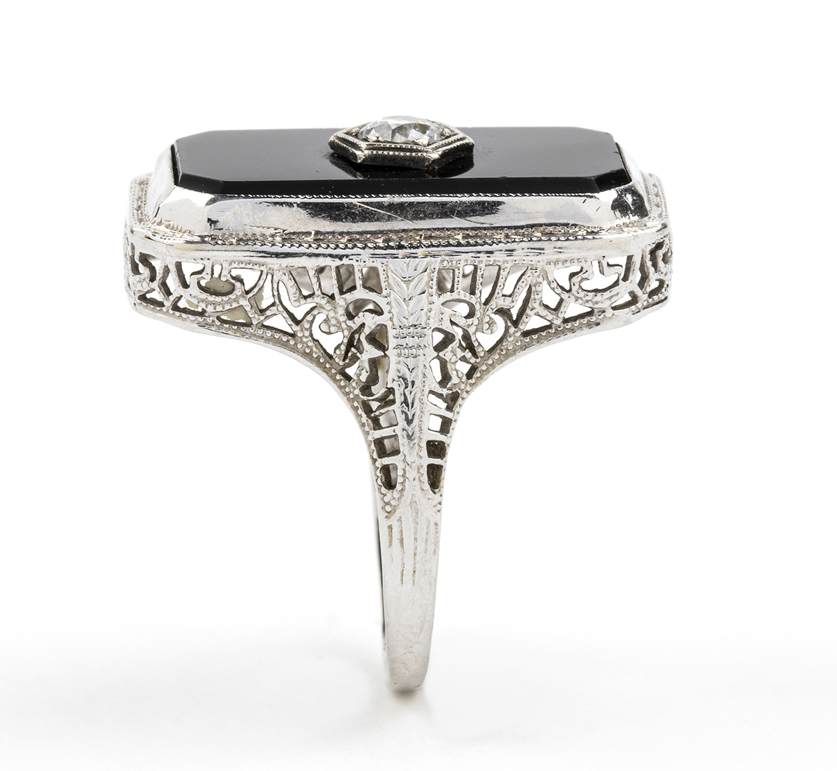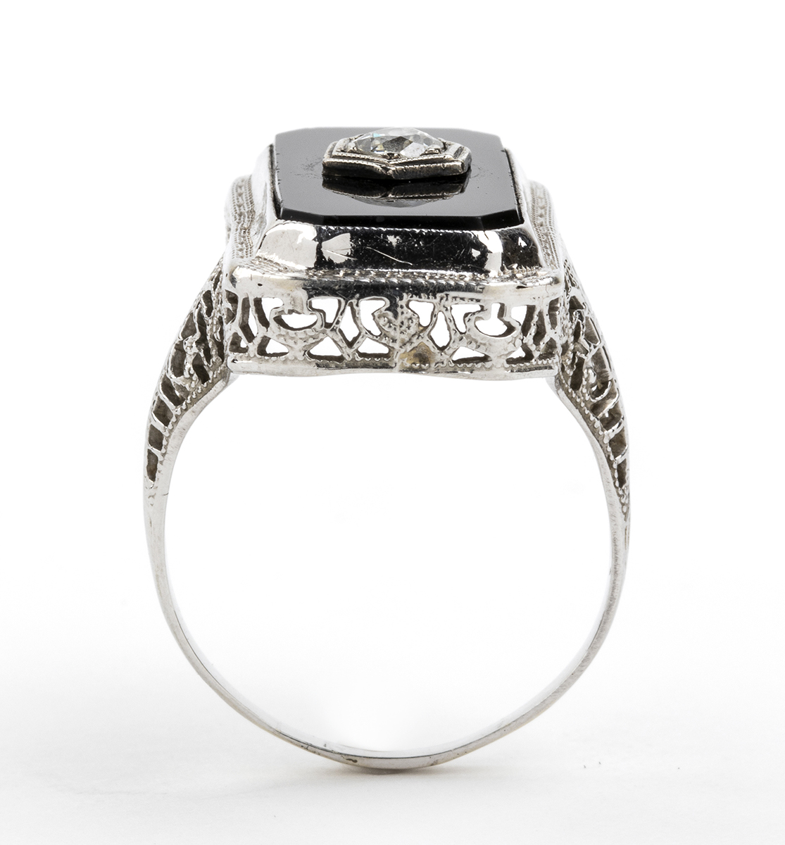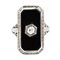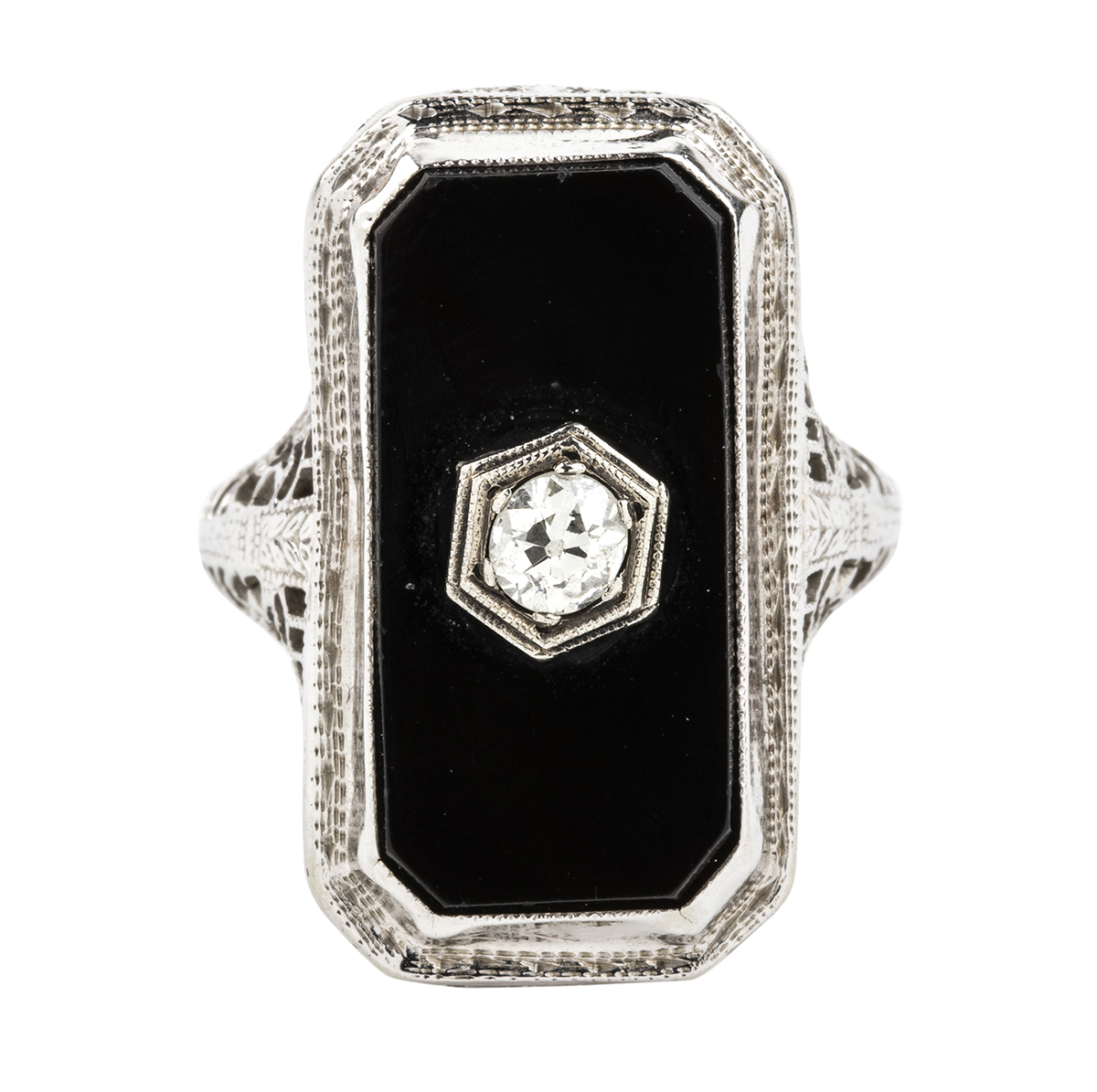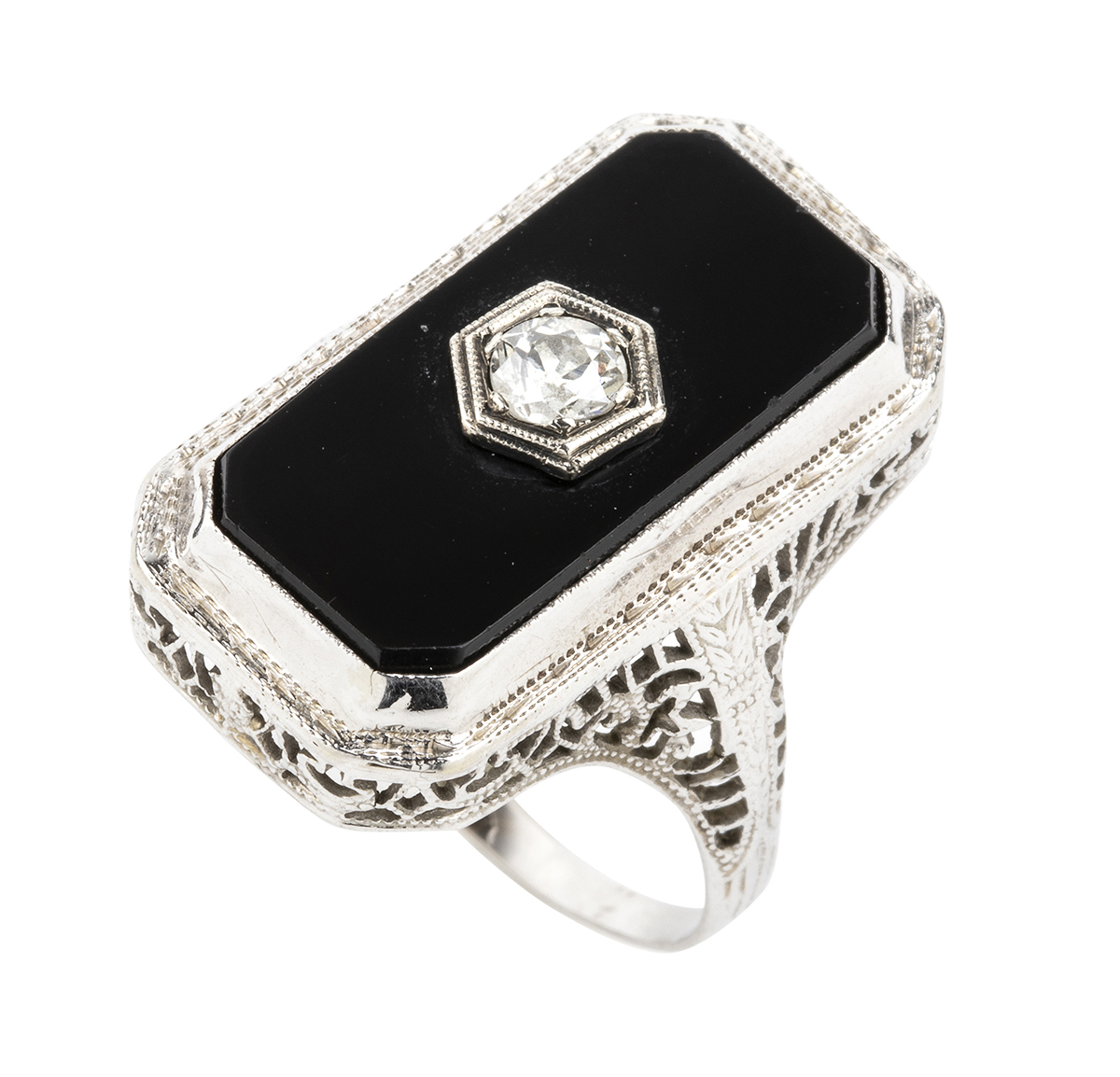 oro bianco 18k, traforato a motivi vegetali, con inserto in onice e diamante incastonato solitario. Diamante taglio old mine 0,20 ct circa. Punzonato "18k".