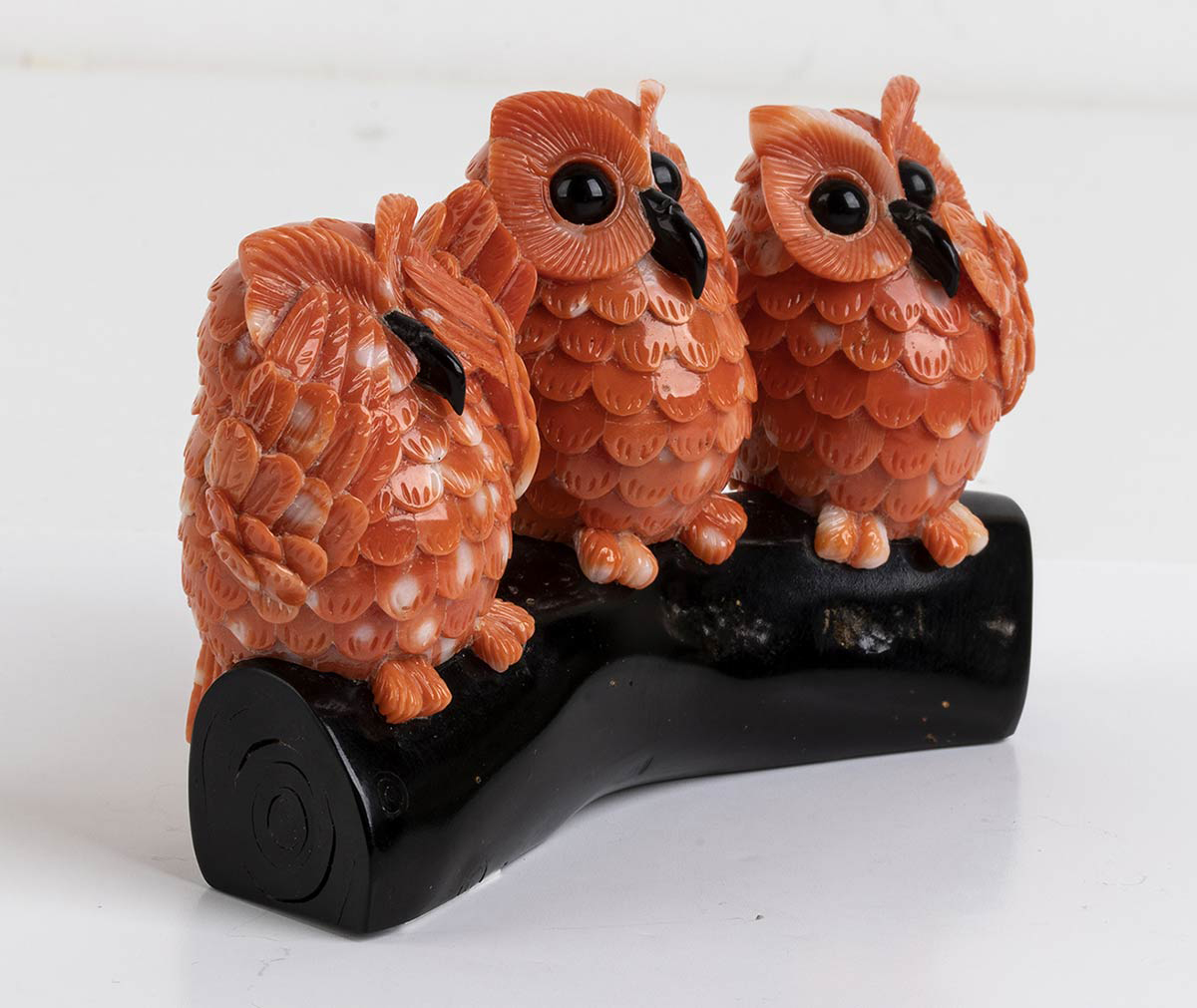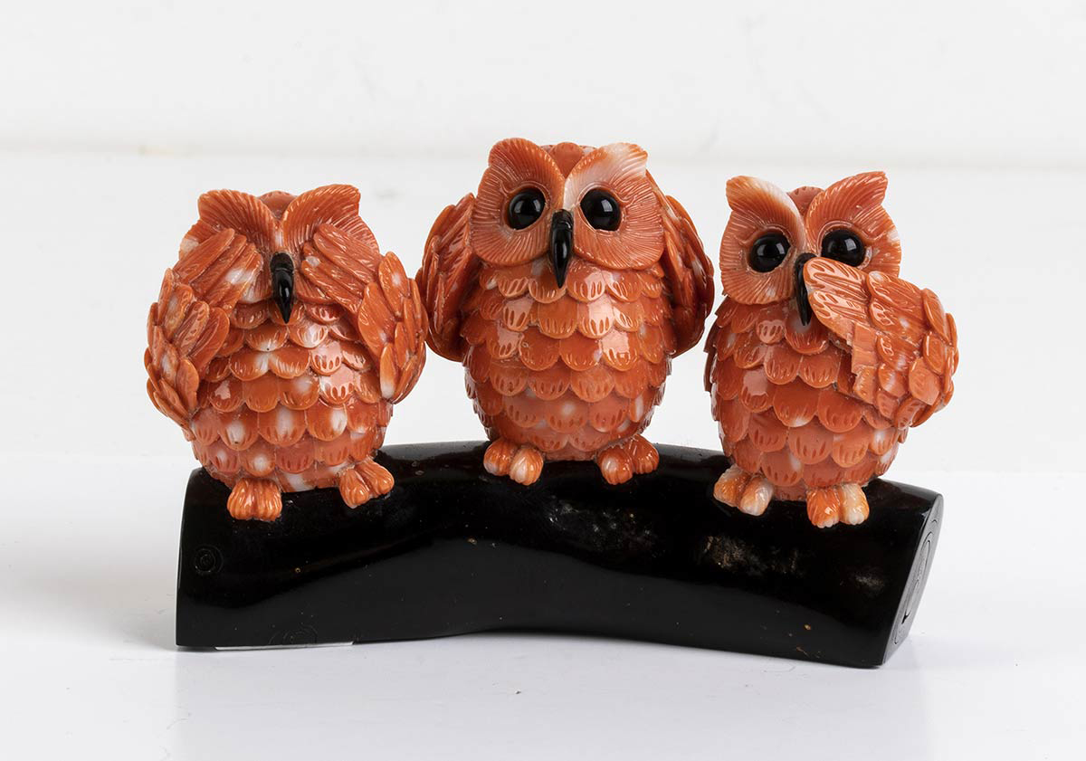 (corallium elatius) raffigurante tre civette saggie, del principio proverbiale del "non vedere il male, non sentire il male, non parlare del male".