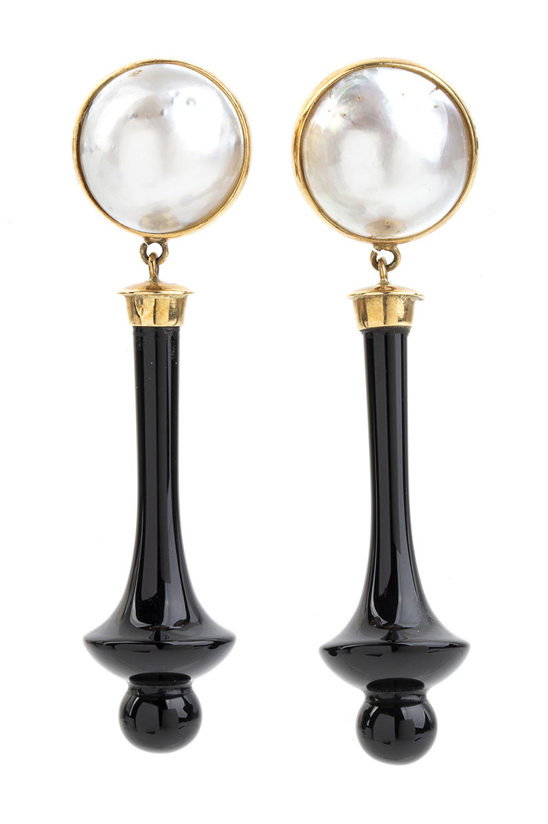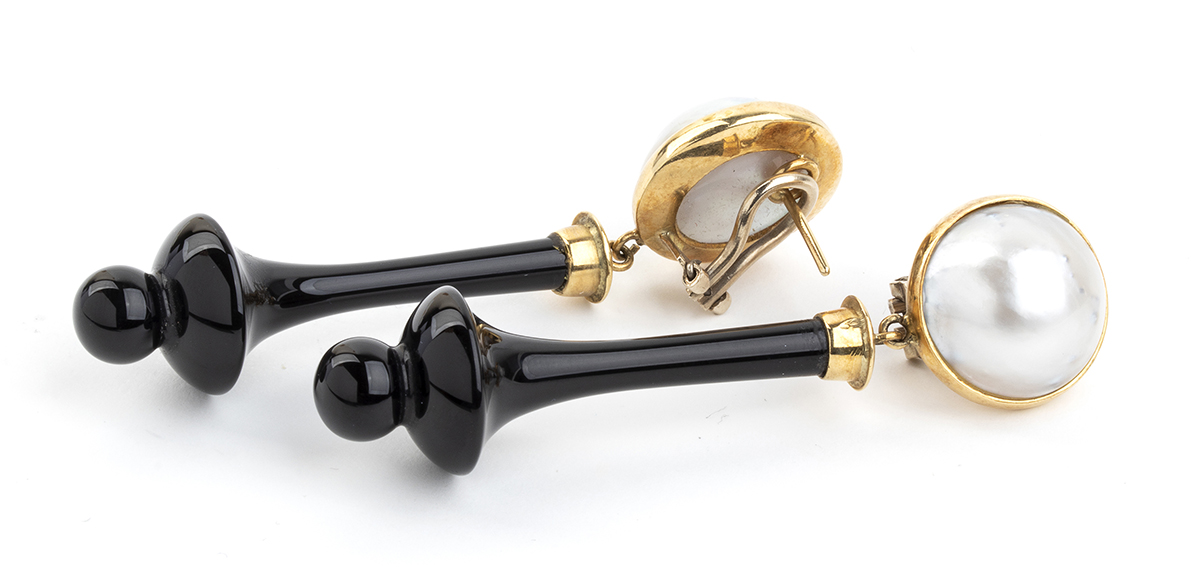 Orecchini in oro con perle mabé e pendente in onice