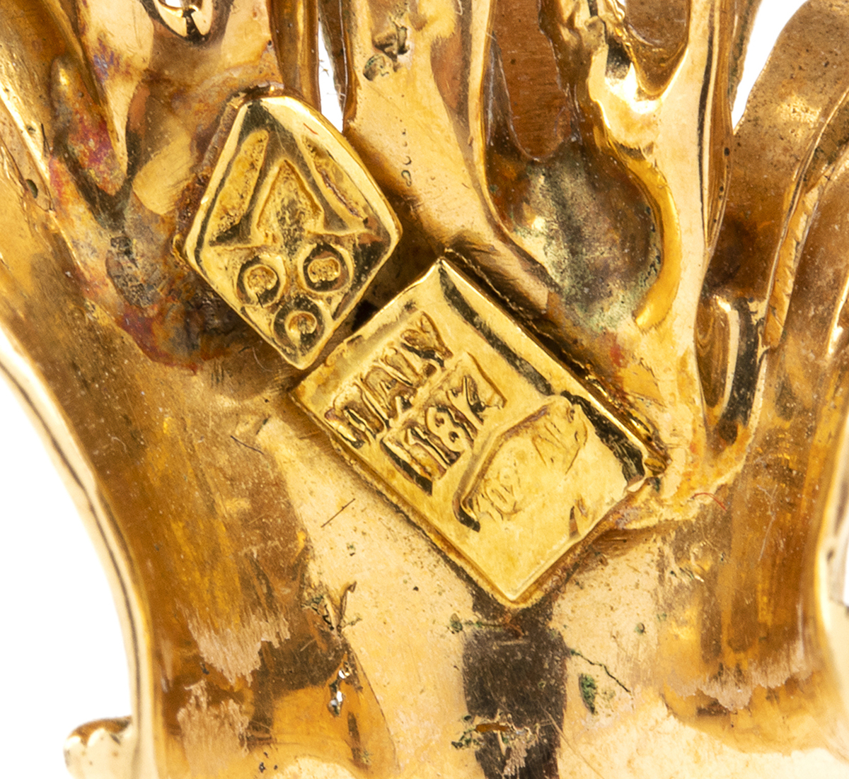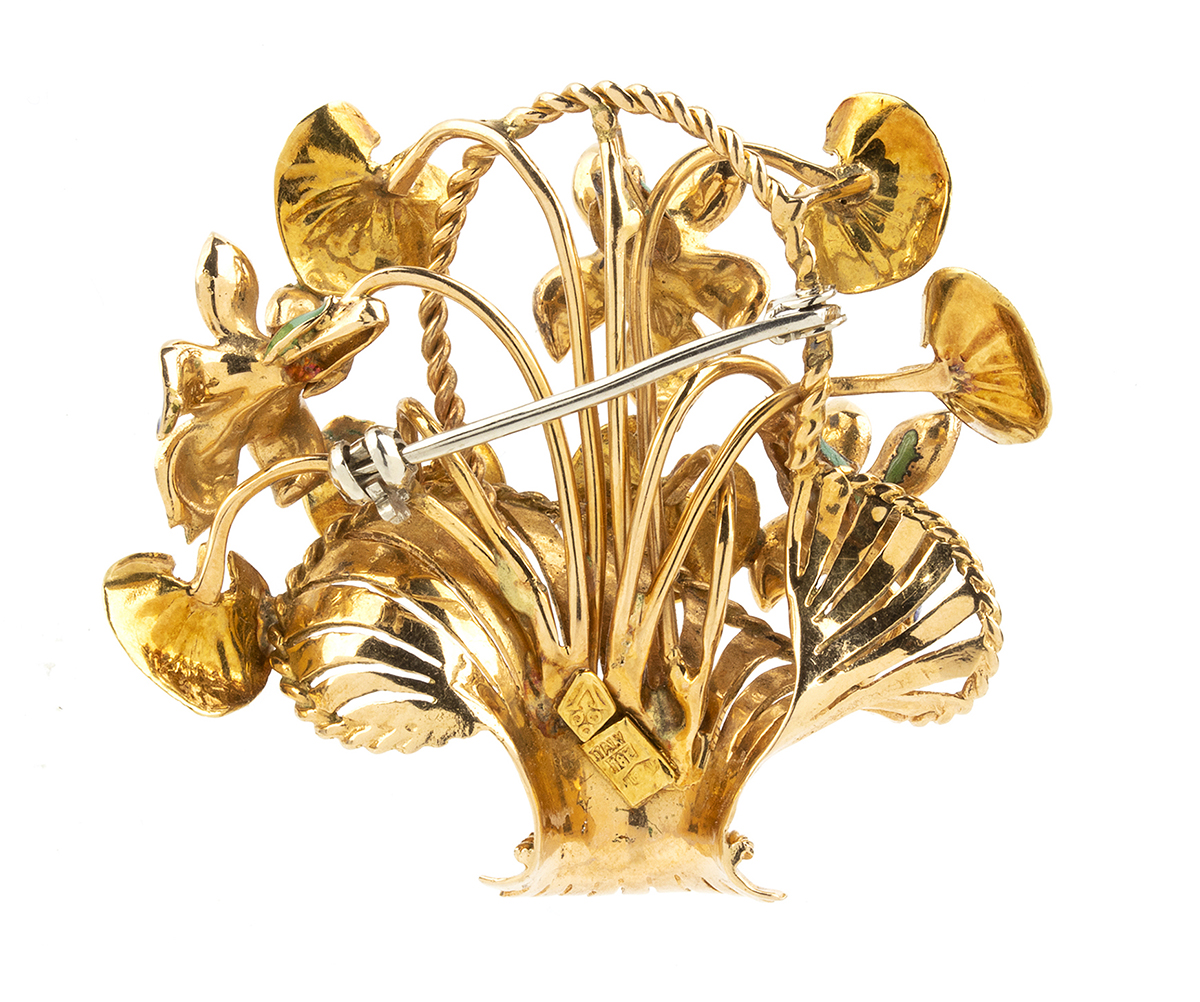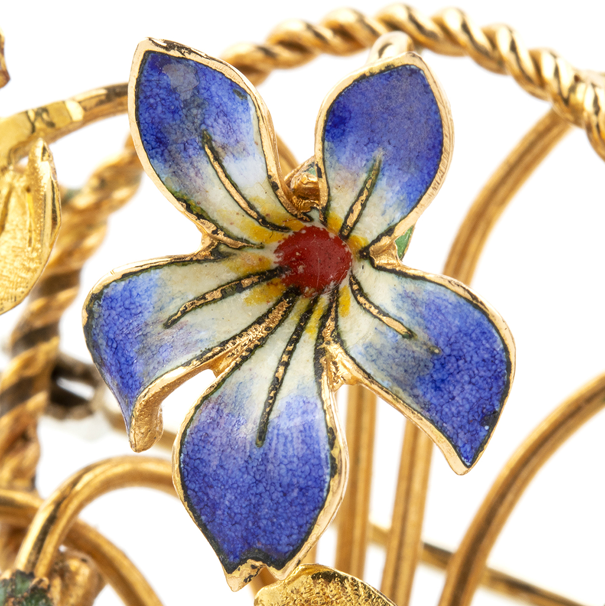 oro giallo 18k, raffigurante un cesto con fiori in smalti policromi. Punzonato "18K - ITALY - 102 AL".