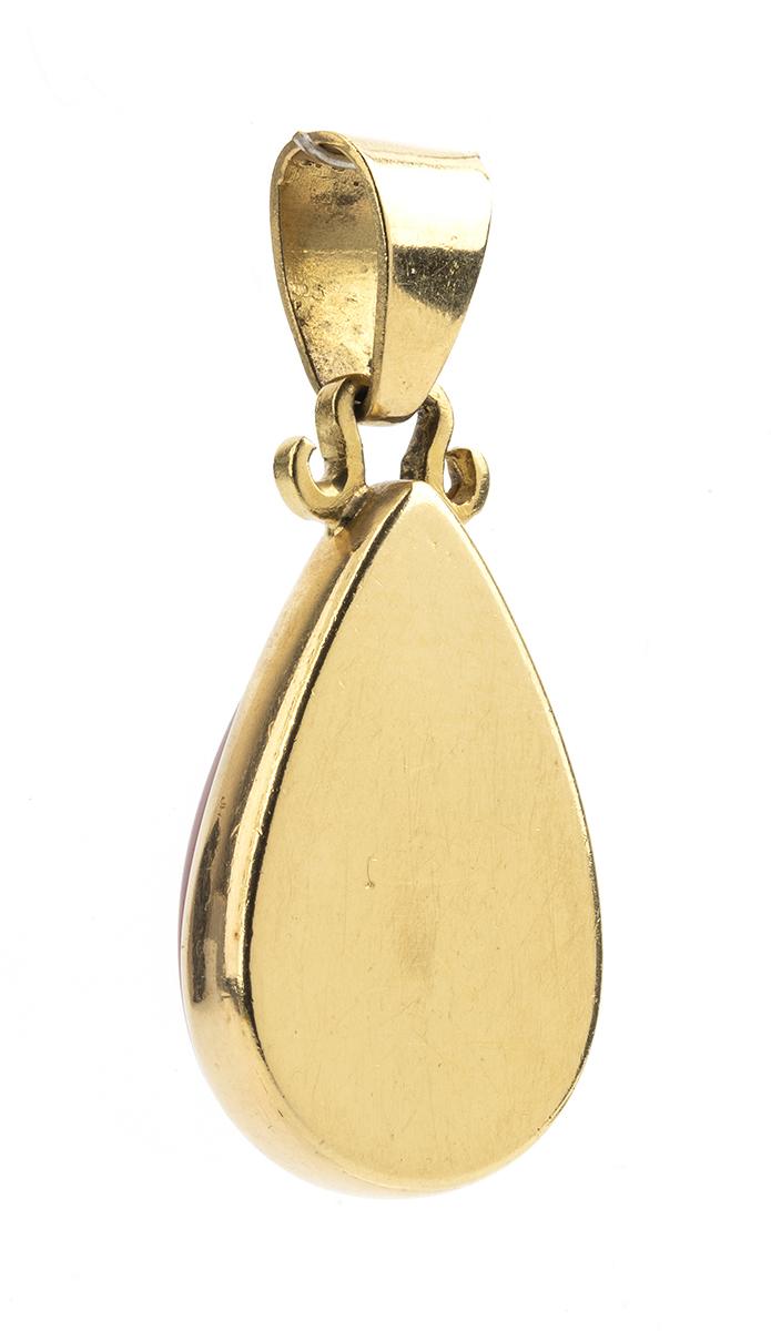 oro giallo 18k, incastonato con goccia di corallo cerasulo (corallium elatius).