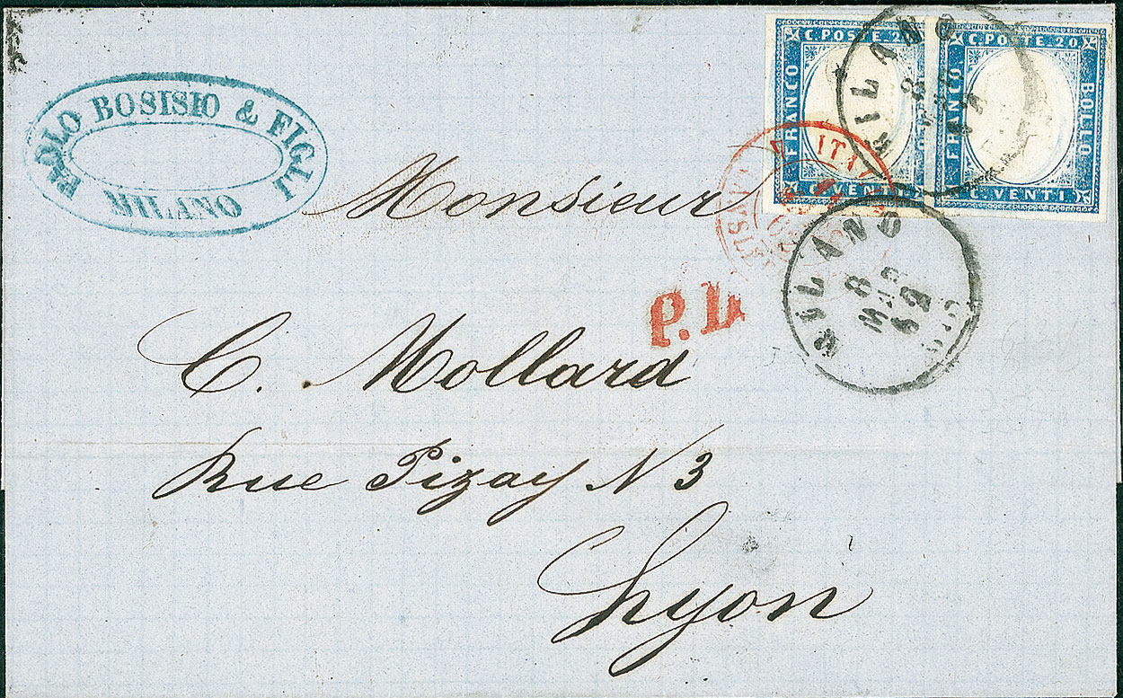 ANTICHI STATI - Sardegna - Due 20 cent su lettera da Milano a Lione del...