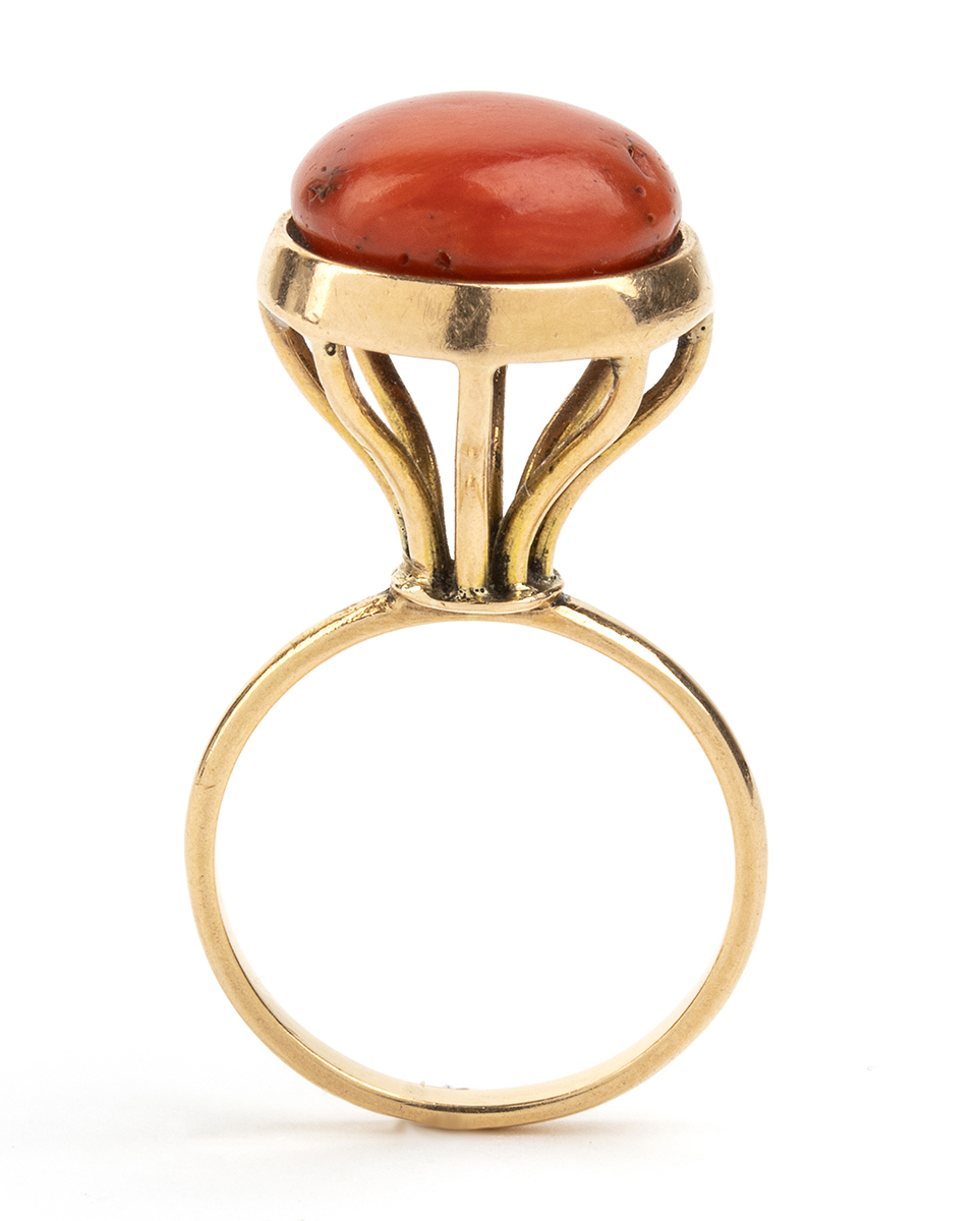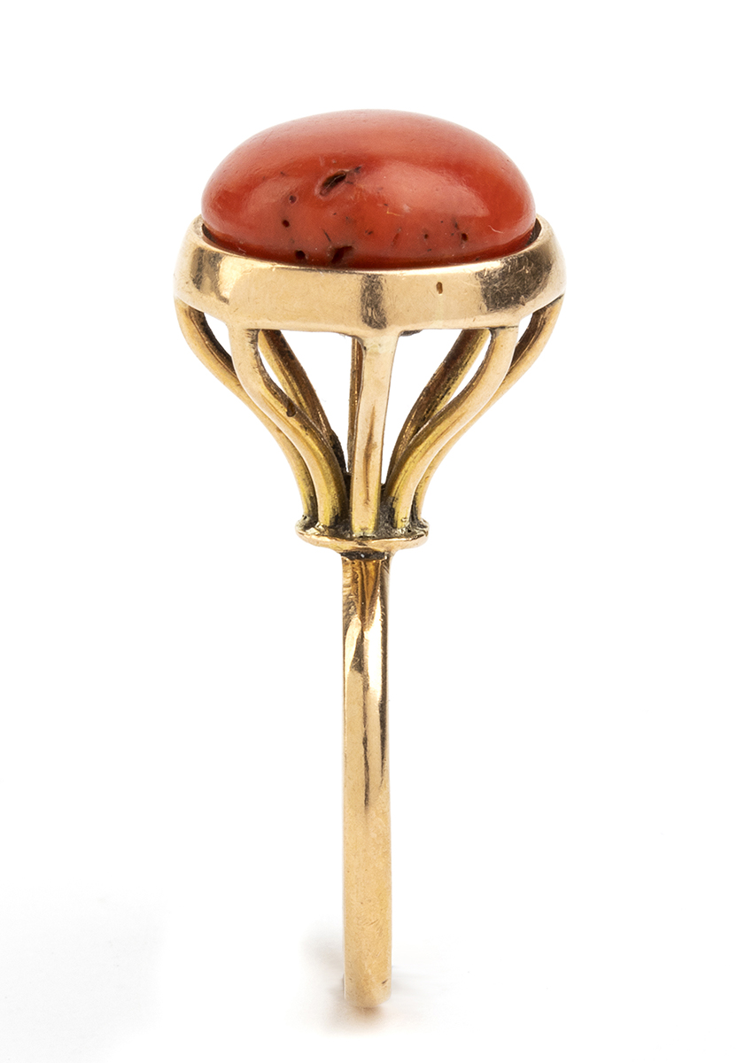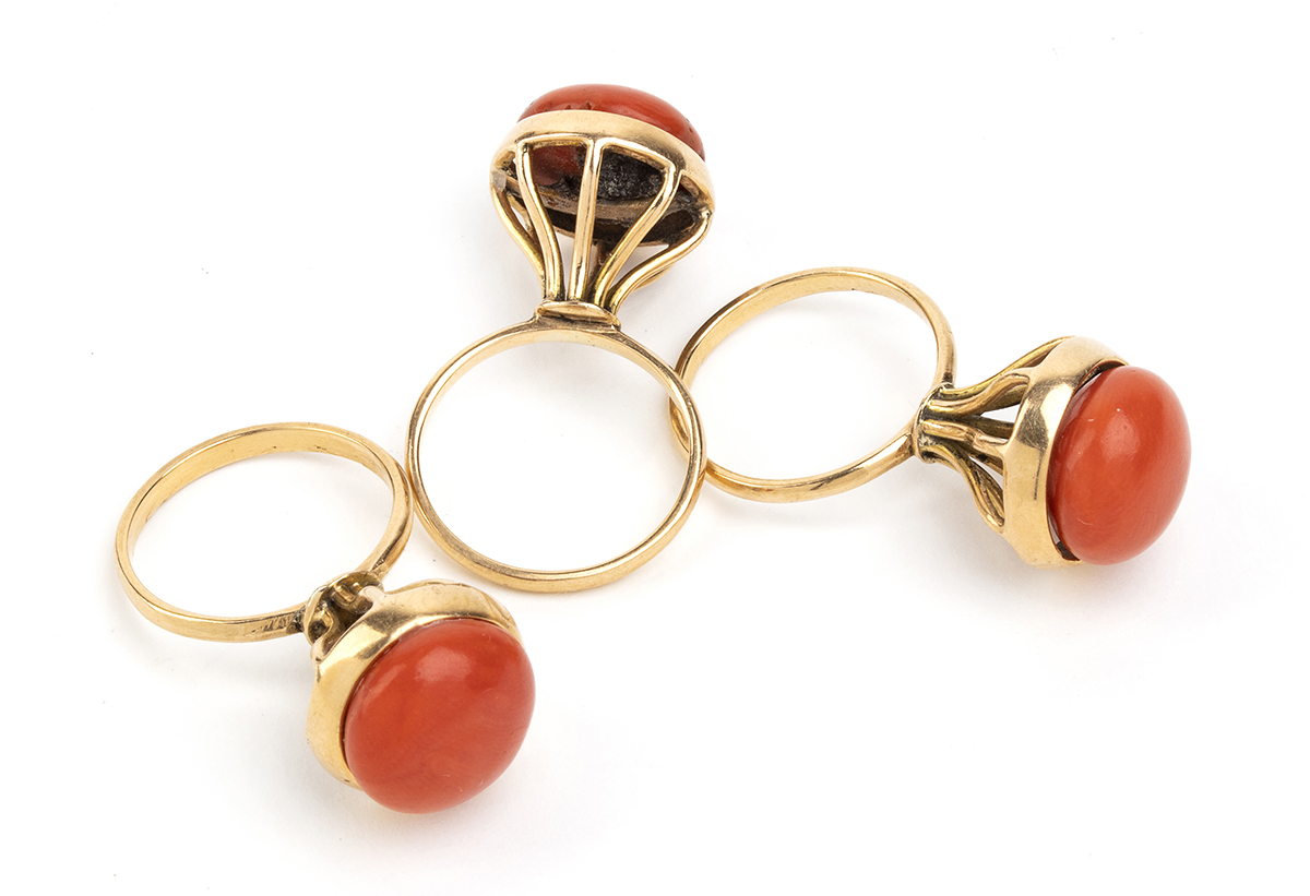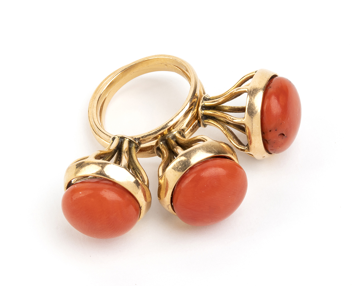 oro giallo 18k, ciascuno incastonato con cabochon di corallo.
